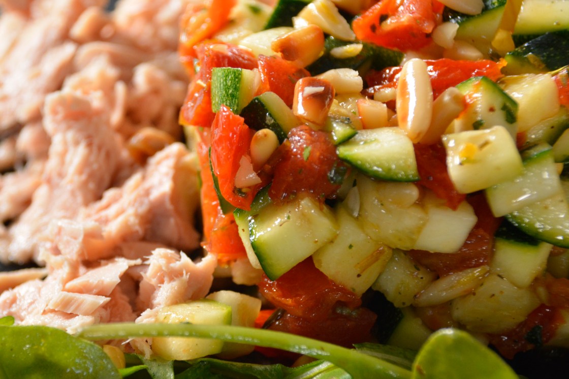 - Die Zucchini- Tomatenmischung in der Vinaigrette marinieren lassen, am besten 1-2 Stunden.