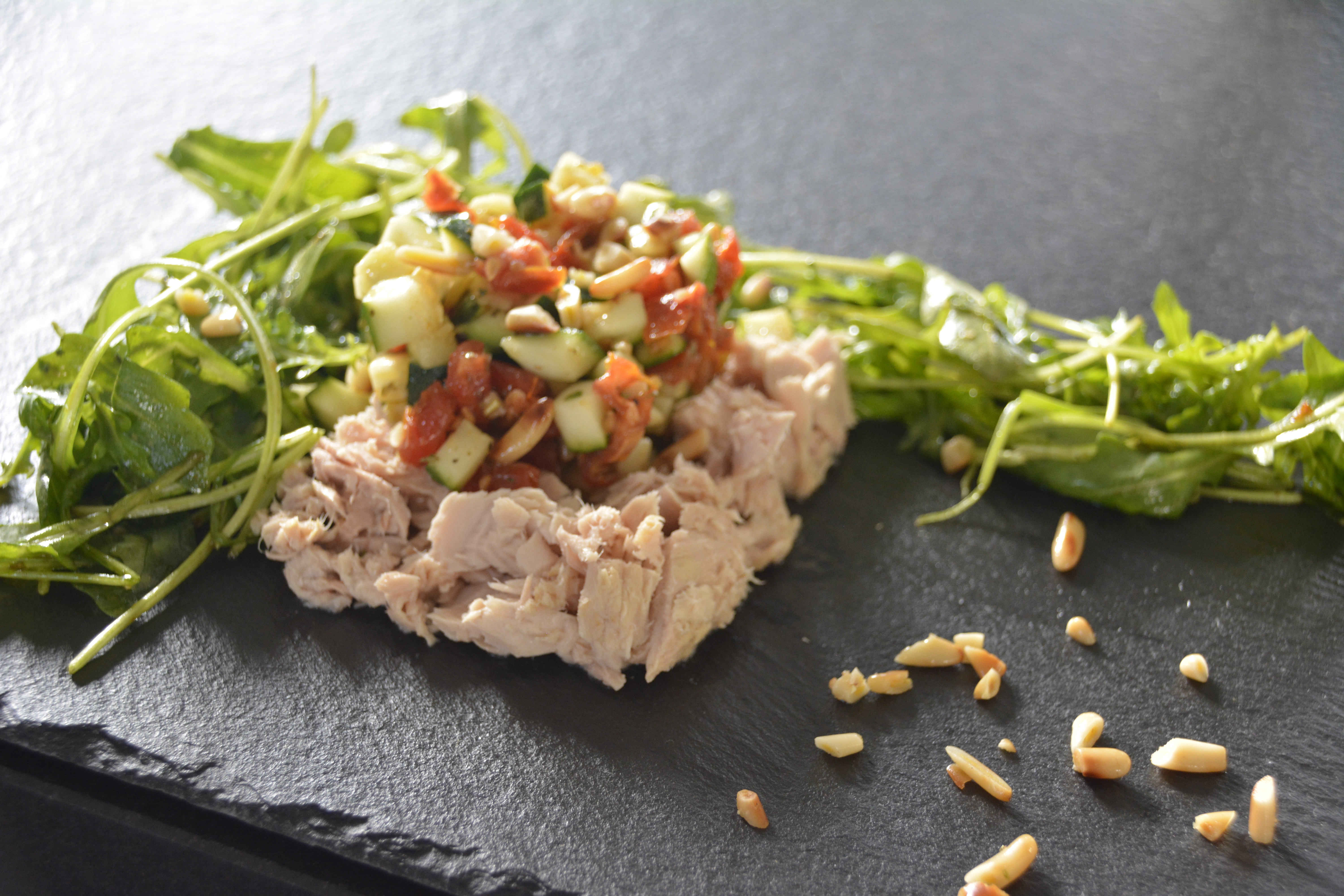 Den Rucola auf dem Teller anrichten, mit etwas Vinaigrette beträufeln. Einen Portionierring auf den Rucola setzen, und dann mit der Zucchinimischung auffüllen, und etwas fest drücken. Den Thunfisch um die Zucchinimischung verteilen, den gerösteten Schinken auf die Zucchinimischung streuen, den Portionierring entfernen, und das ganze servieren. Guten Appetit.