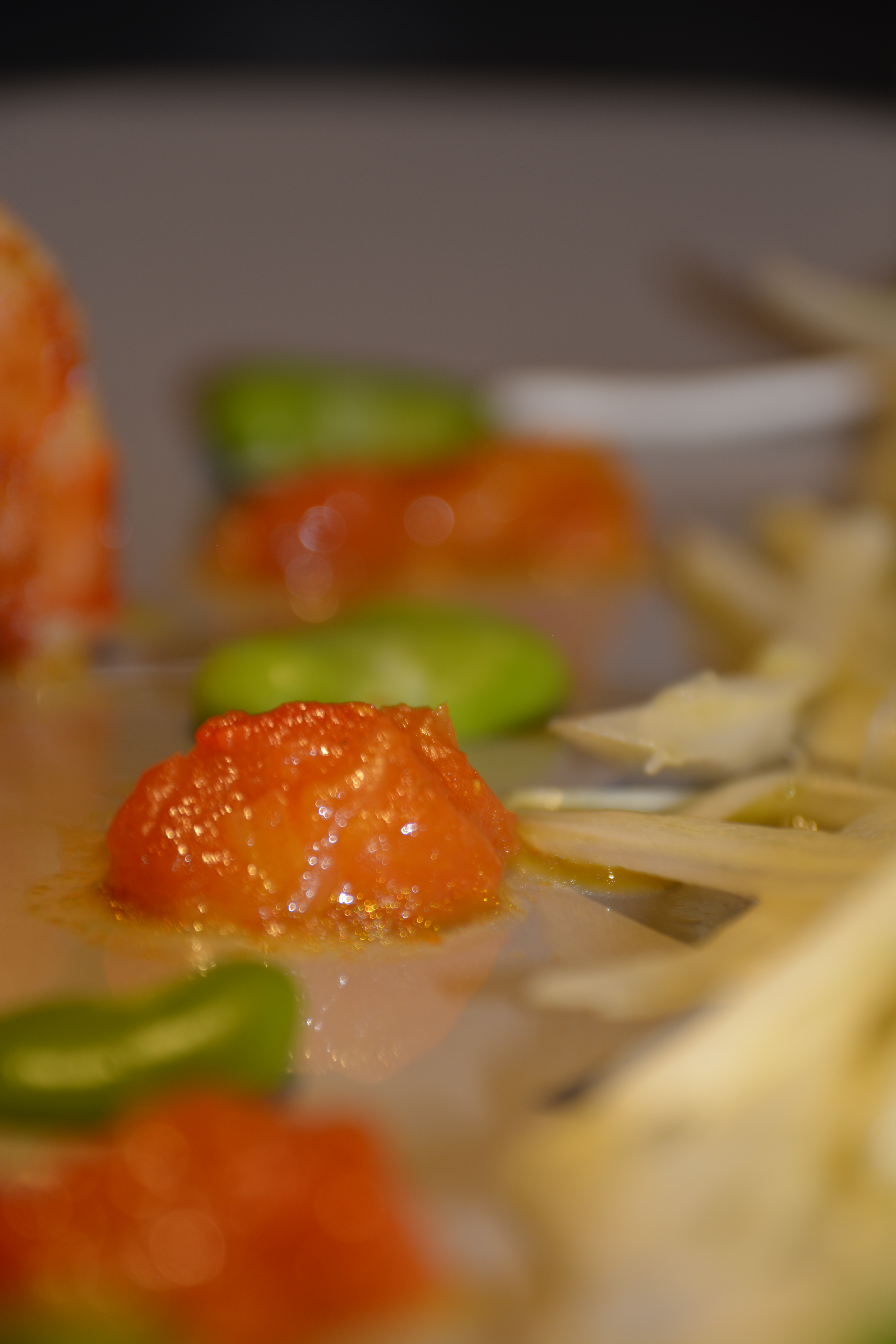 Die Schalotten werden ebenfalls in kleine Würfel geschnitten, im Olivenöl angedünstet, dann kommen die Tomaten dazu, so wie der plattgedrückte Knoblauch, das bouquet garni, die Prise Zucker und die Safranfäden. Jetzt lasse ich das Ganze während 20 Minuten köcheln. Später schmecke ich mit etwas Salz und Pfeffer ab.