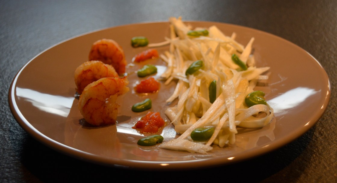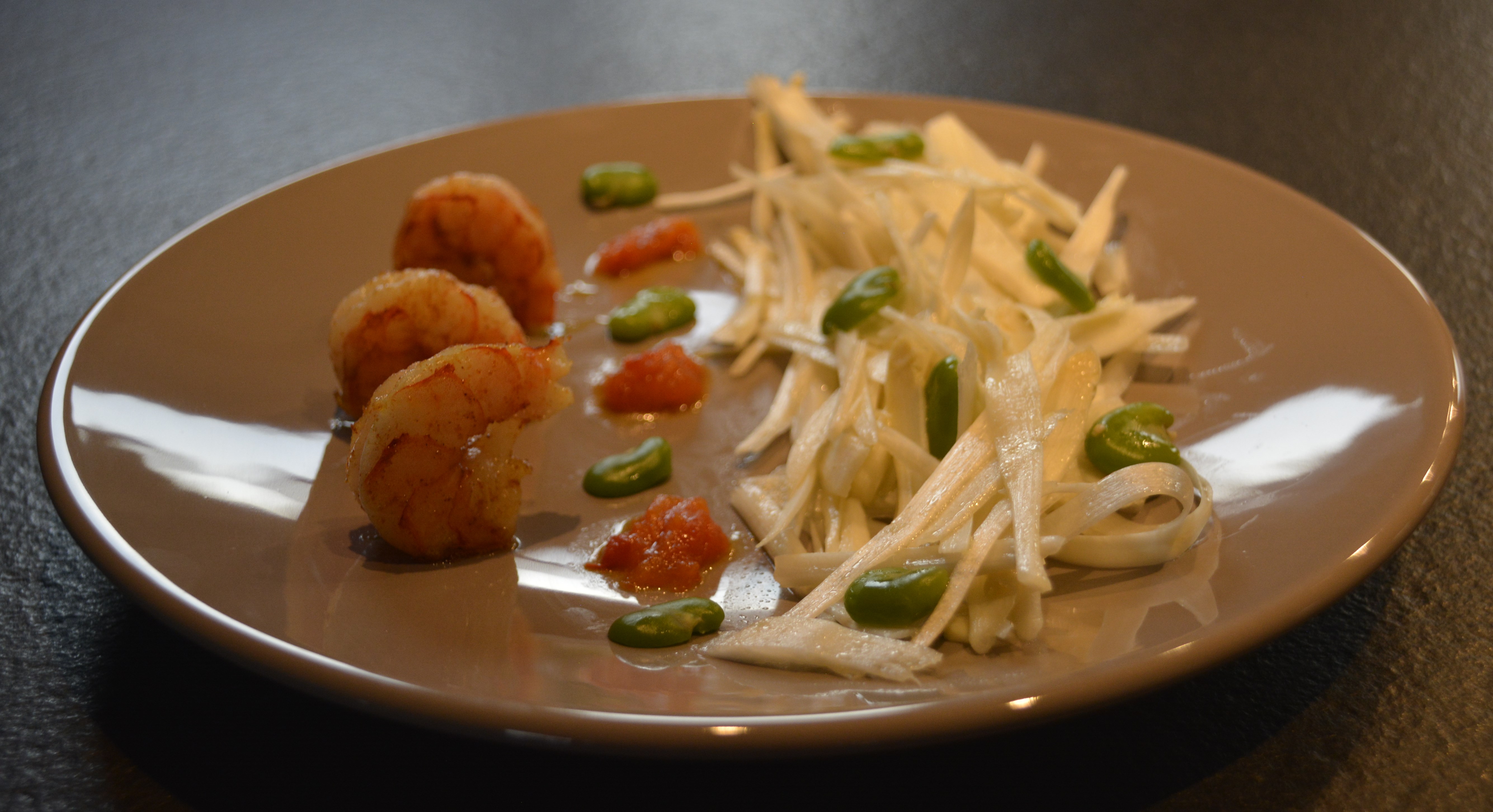Jetzt noch schnell die Garnelenschwänze in etwas Olivenöl anbraten , und schon können wir anrichten.