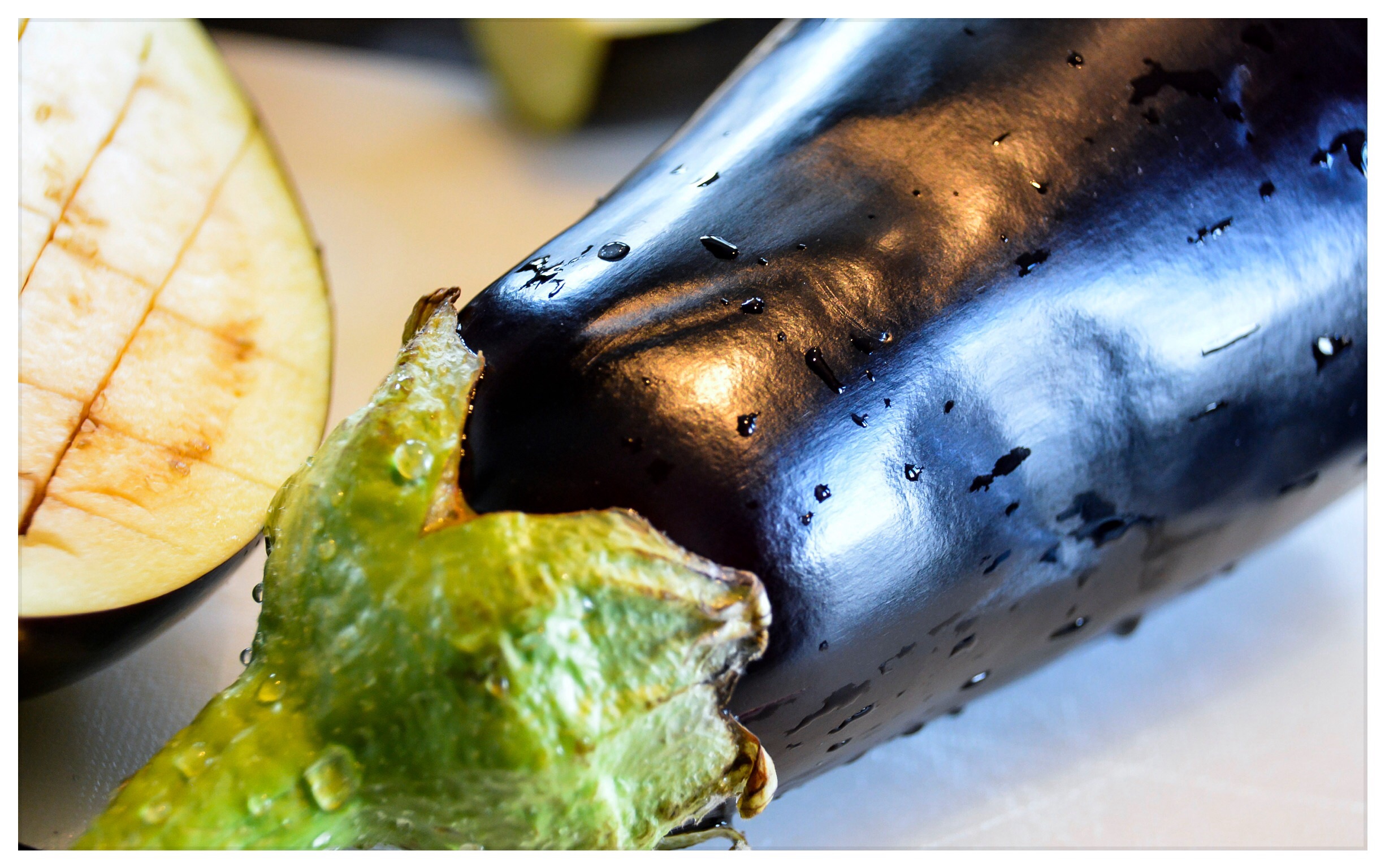 Jetzt die Auberginen in der Mitte teilen, mit einem scharfen Messer Quadrate einschneiden, salzen und pfeffern und grosszügig mit Olivenöl einpinseln, in den Ofen schieben für 45 min. – 1 Stunde, bis sie schön goldbraun und gar sind. Zwischendurch immer wieder mal mit Öl nachpinseln. Aus dem Ofen nehmen , das gut gegarte Fleisch aus der Schale kratzen , mit dem Stabmixer pürieren, den Basilikum kleinzupfen und drunter heben. Mit Salz und Pfeffer abschmecken.