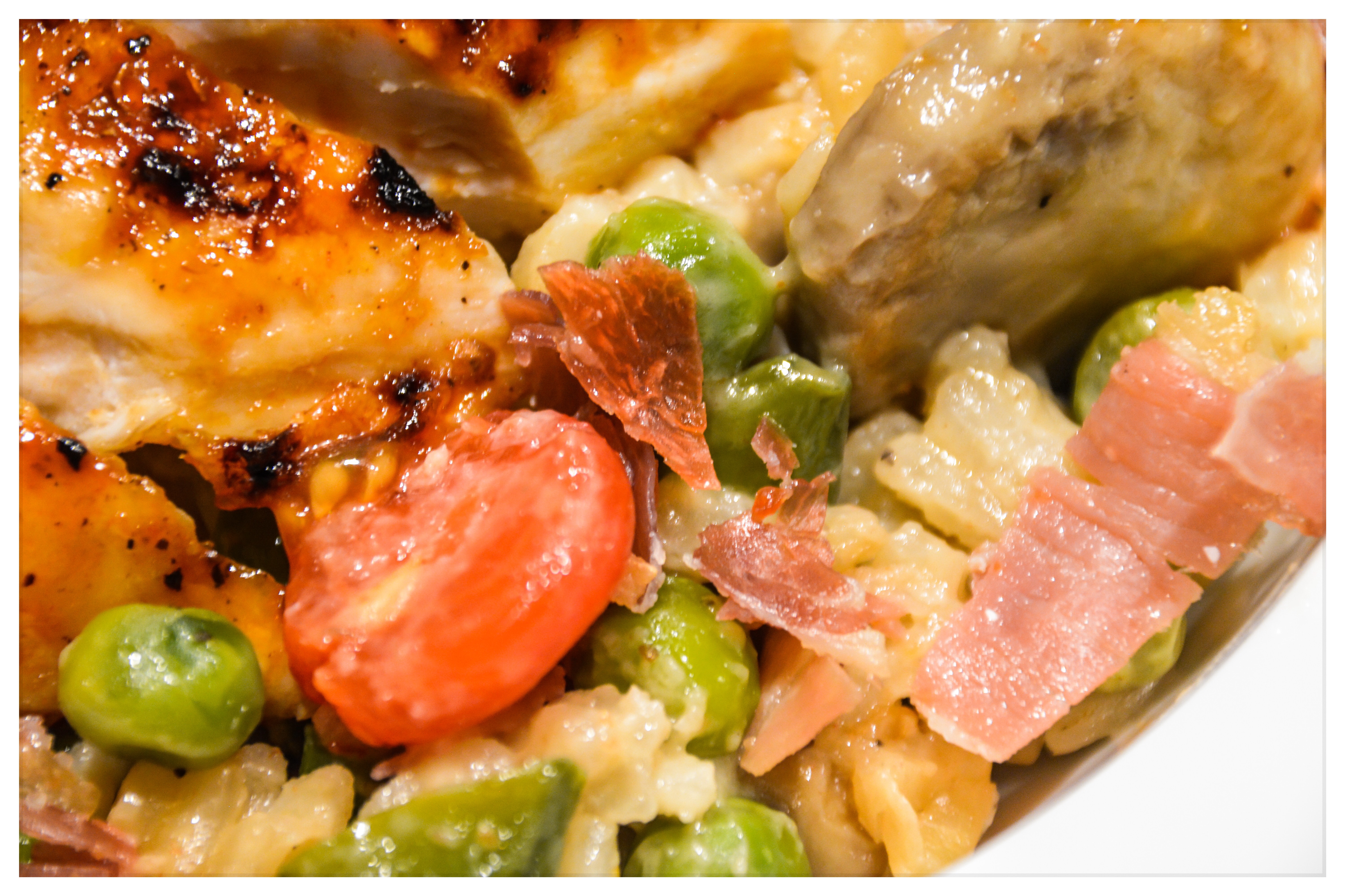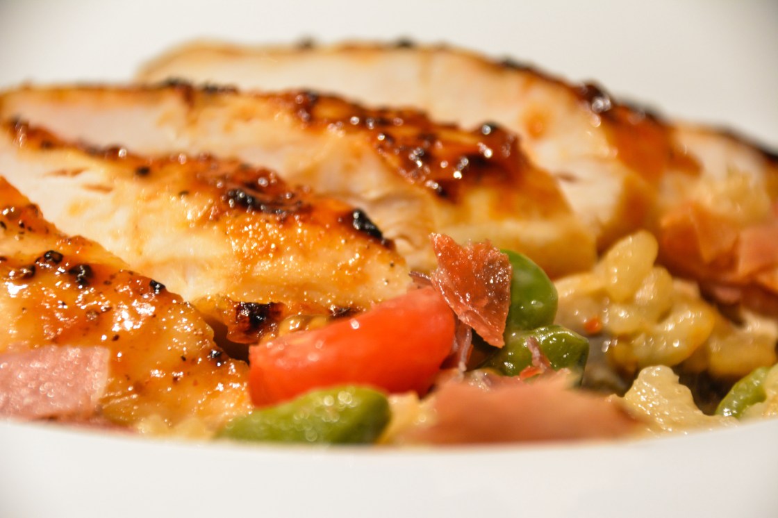 Das Risotto auf einem Teller anrichten, die Hähnchenbrust schneiden und auf das Risotto legen. Mit den Schinkenbrösel bestreuen.
