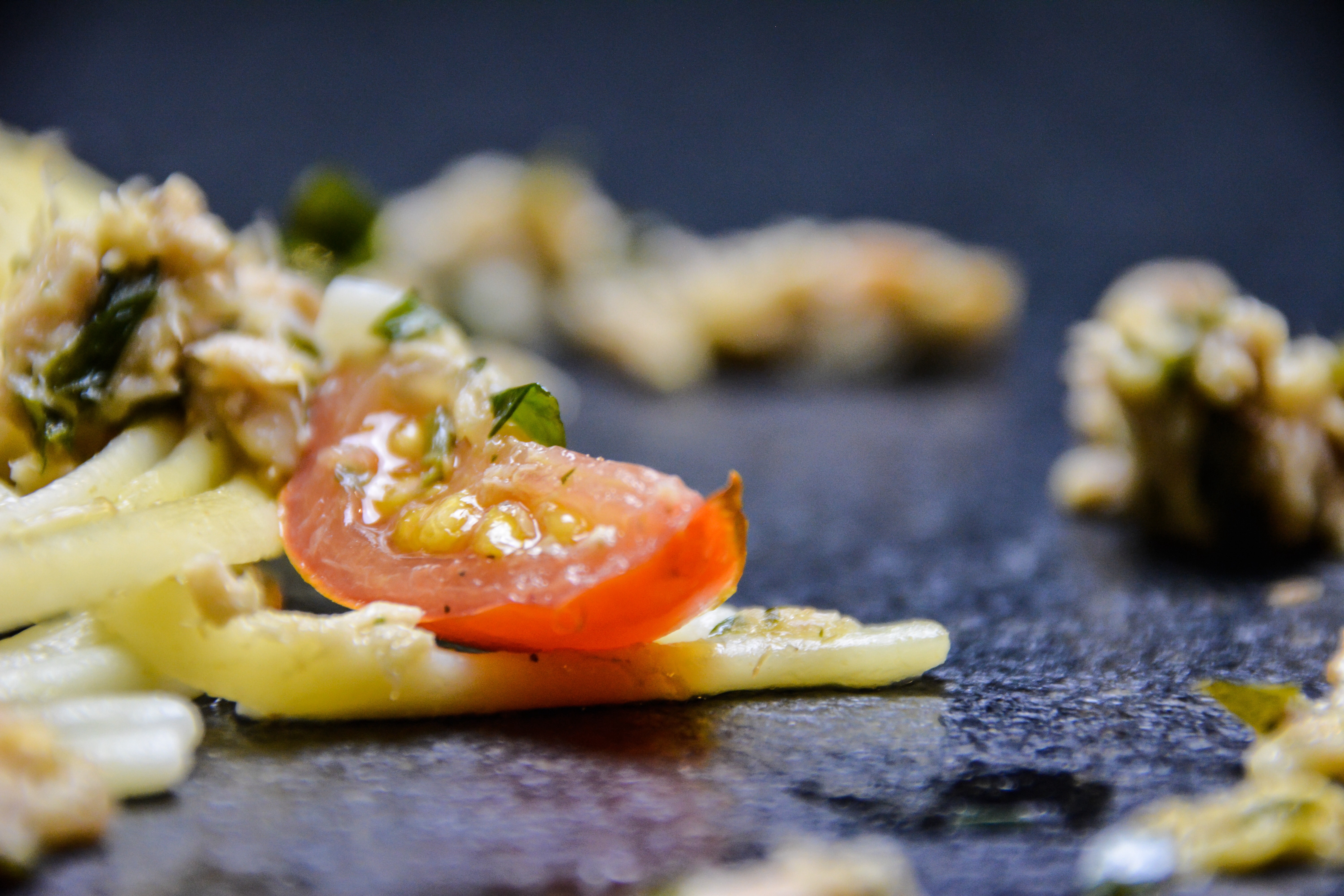 Sobald die Sardellen geschmolzen sind, den Thunfisch dazu geben, einmal umrühren, erwärmen und mit dem Weisswein ablöschen. 3 Minuten einkochen lassen , bis eine etwas dickliche Sauce entsteht. Grosszügig pfeffern, die Kirschtomaten dazu geben und die Petersilie einstreuen.