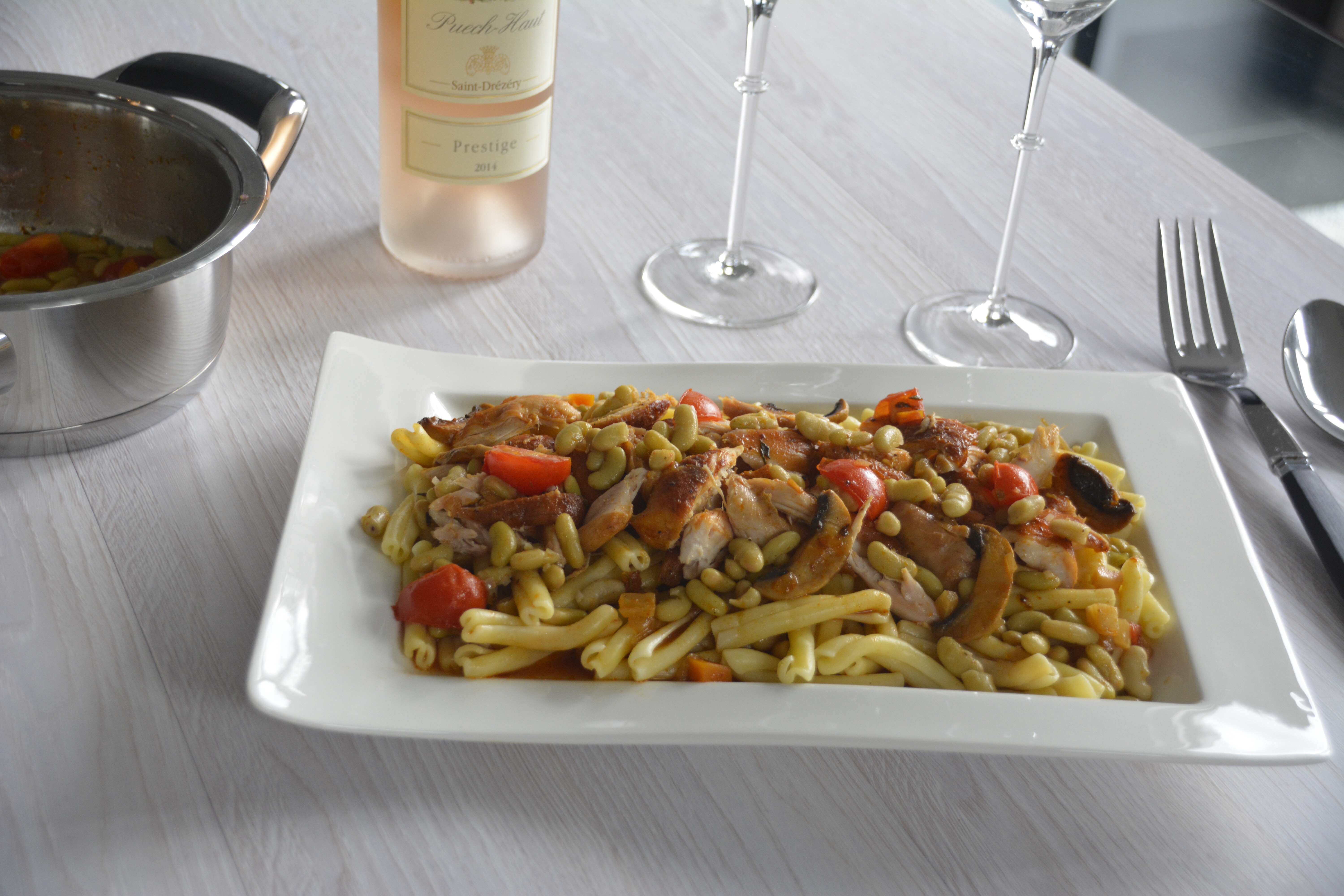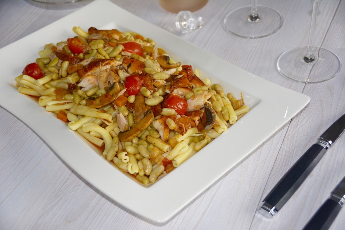Das Fleisch aus dem Ofen nehmen , von den Knochen machen und in Stücke zupfen. Die Flageotletbohnen mit etwas Knoblauch in Olivenöl kurz andämpfen, die Kirschtomaten in der Mitte durchschneiden und mitschwenken. Dann die anderen Zutaten zusammen in die Pfanne geben, Fleisch , Nudeln und Sauce mit dem geschmortem Gemüse. Alles durchschwenken.