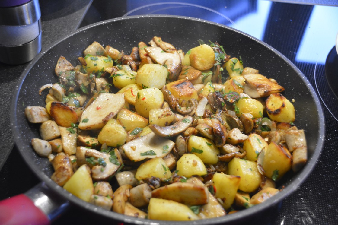 Kleine Kartoffeln ( Grenaille, oder La Ratte) , die Schale lasse ich dran. Ich koch sie etwas vor. Pilze putzen und in mundgerechte Stücke zerteilen. Zwiebel mit Liebe in kleine Würfel schneiden, Petersilie waschen und kleinschneiden mit einem scharfen Messer. Etwas Chili klein hacken, und dann habe ich noch so kleine Bratwürste aus Hähnchenfleisch die ich in Scheiben schneide. Man kann auch Salcicchia nehmen oder was man gerade an Fleisch hat zum braten. Z.B. ein Rest vom Sonntagsbraten, den man in kleine Stücke schneiden kann. Auch da sind ihrer Fanatasie wieder einmal keine Grenzen gesetzt.