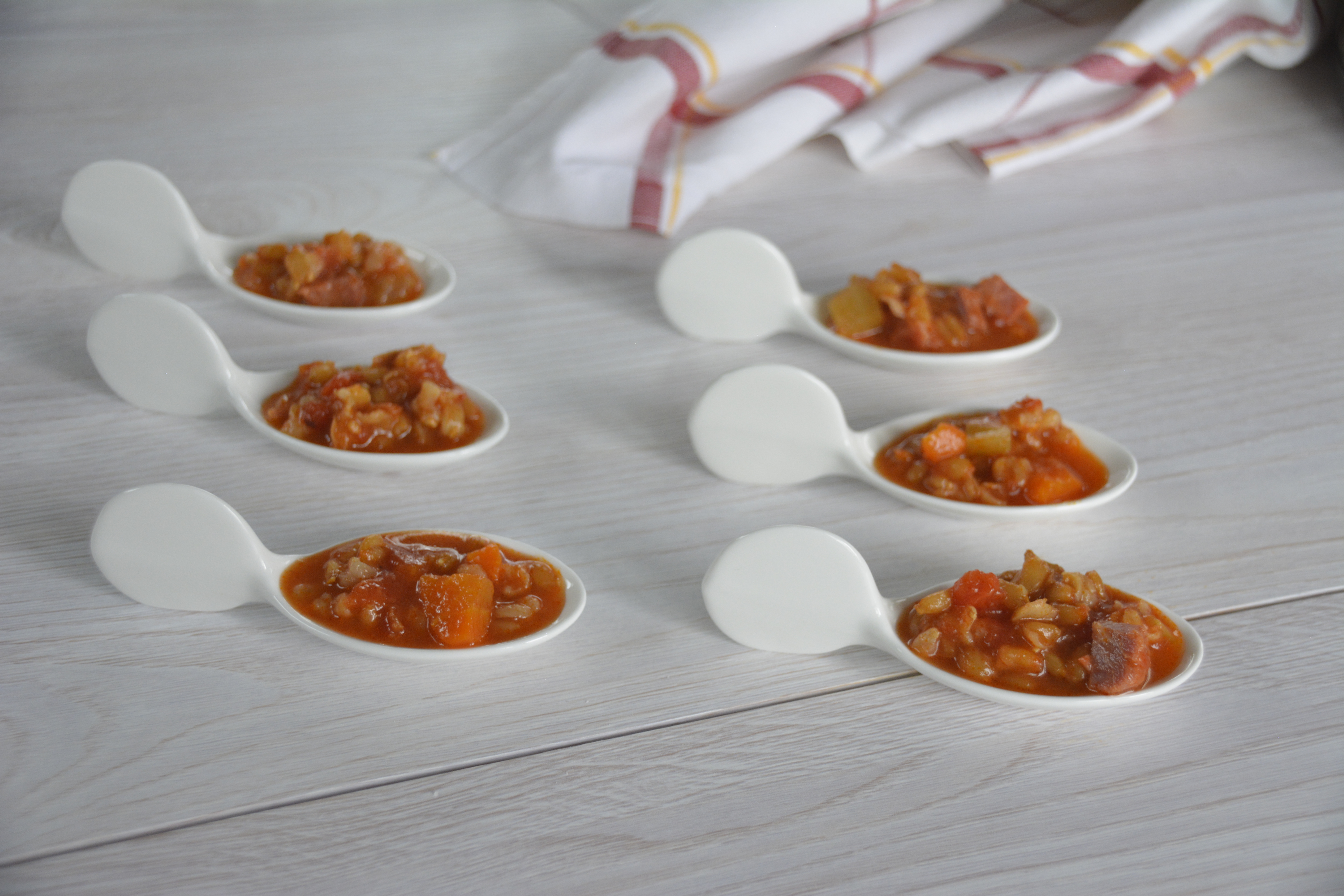 - Olivenöl in einem grossen Topf erhitzen. Zuerst die Zwiebeln glasig andünsten. Karotte und Selleriestange dazu geben. Das Ganze 3-4 Minuten mit anbraten, mit dem Weisswein ablöschen und mit der Brühe und den kleingeschnittenen geschälten Tomaten auffüllen.Die Gewürze dazu geben. Aufkochen lassen und jetzt den Dinkel dazu geben. Das Ganze bei mittlerer Hitze köcheln, während ungefähr 50 Minuten. Wenn nötig vielleicht noch einmal etwas Brühe dazugeben. Und fertig ist’s