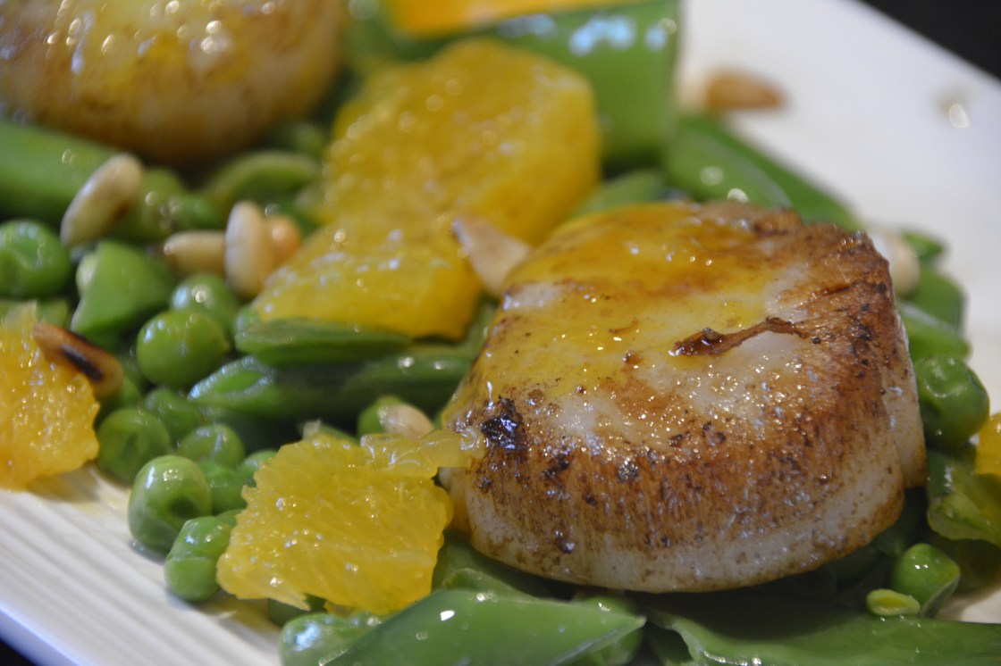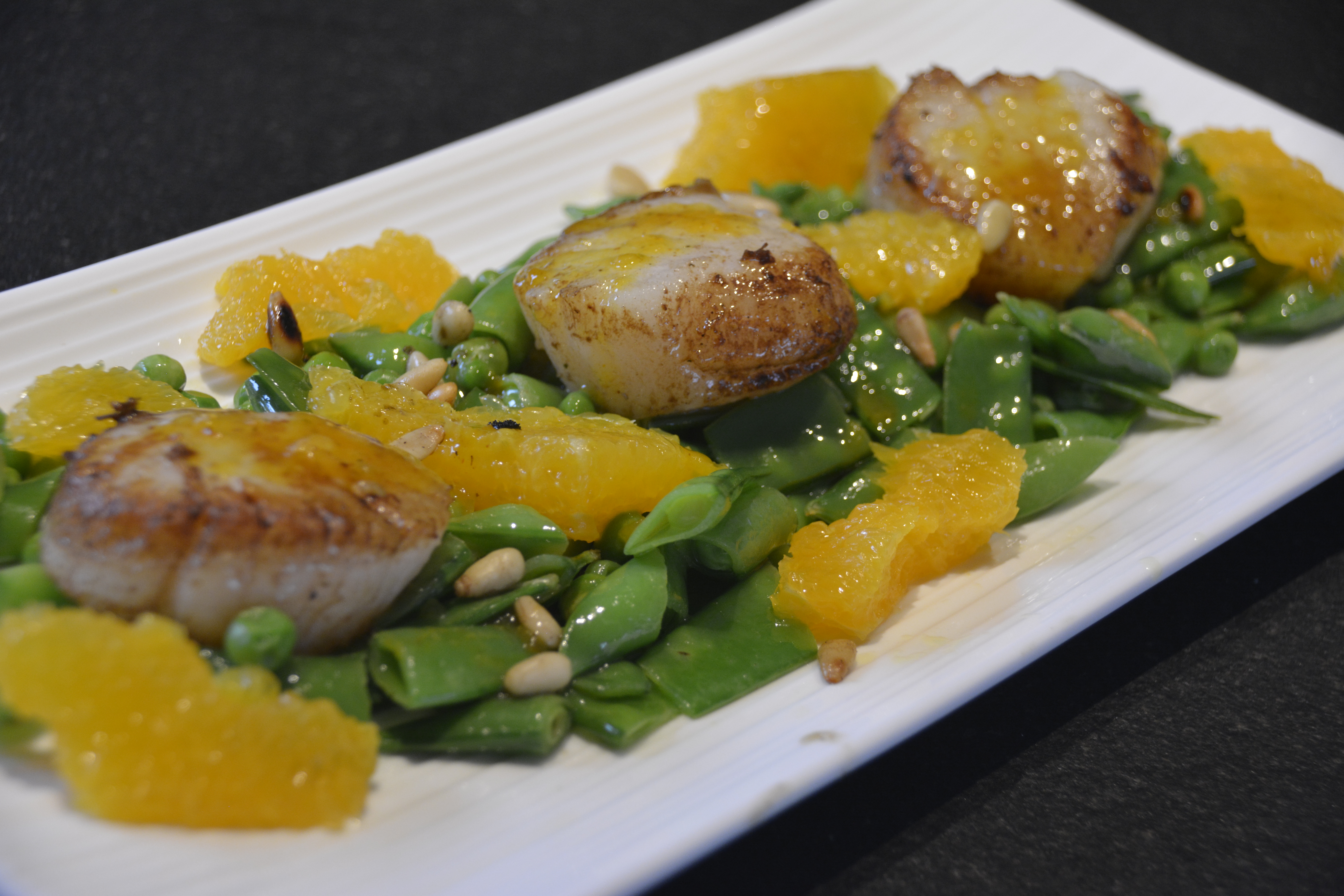 Die Zuckerschoten auf einem Teller anrichten, die gebratenen Jakobsmuscheln drauf setzen, die Orangenfilets auf dem Teller verteilen, die gerösteten Pinienkerne drüberstreuen und mit der leckeren Orangen Curry Sauce beträufeln.