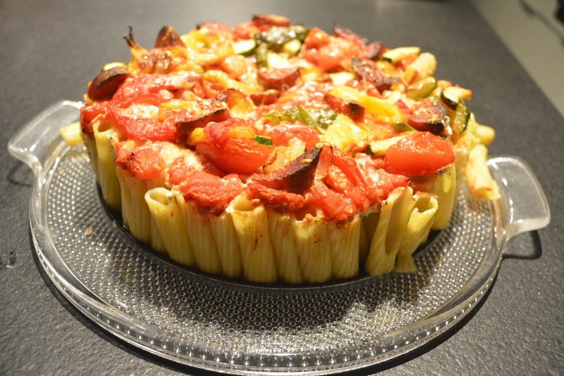 Die Füllung in der Mitte ist aus einer Not heraus entstanden, mir fehlten eine handvoll Nudeln um die Form voll zu bekommen. Da habe ich einfach, mit dem gedämpten Gemüse das Loch gestopft.