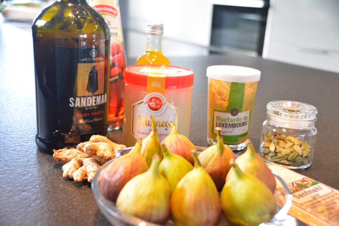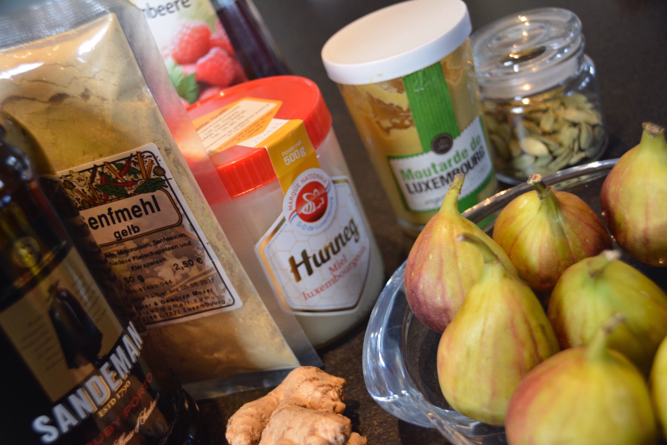 Feigen waschen und schälen, Stielansatz entfernen und mit Liebe klein schneiden. In einer kleinen Schüssel das Senfmehl mit dem Senf und der Hälfte des Himbeeressigs verrühren, zur Seite stellen bis zum Schluss, damit er etwas quellen kann. Den Honig in einem Topf erwärmen, etwas köcheln lassen, bis er hellbraun wird. Mit dem Porto und dem restlichen Himbeeressig ablöschen. Die Gewürze, so wie den fein geriebenen Ingwer dazu geben, aufkochen, zugedeckt auf kleinster Stufe 10 Minuten ziehen lassen. Durch ein feines Sieb passieren. Die Feigenwürfel dazu geben und 10 Minuten köcheln lassen, dann den angerührten Senf beifügen. Mit dem Stabmixer sehr fein pürieren, und fertig ist ein sehr feiner , wohlschmeckender Feigensenf. In dem Rezept von Robert macht man nur zwei Drittel der Feigen in den Topf zum aufkochen. Das letzte Drittel kommt nach dem pürieren dazu und muss deshalb auch noch einmal aufgekocht werden. Ich mag es lieber wenn alles püriert ist, aber wie ich immer sage: Jeder so wie er mag!