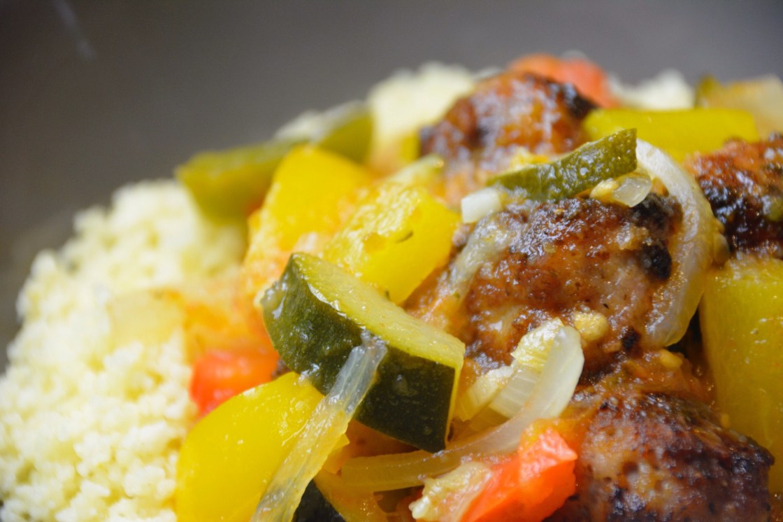 Nun wird angerichtet, Couscous in eine Schüssel oder Teller geben, eine grossen Löffel von der Ratatouille dazugeben. Schön wenn der ganze Saft der Ratatouille sich mit dem Couscous vermischt, und als Krönung die Hachbällchen obendrauf. Mmmmhh…..Yummiii