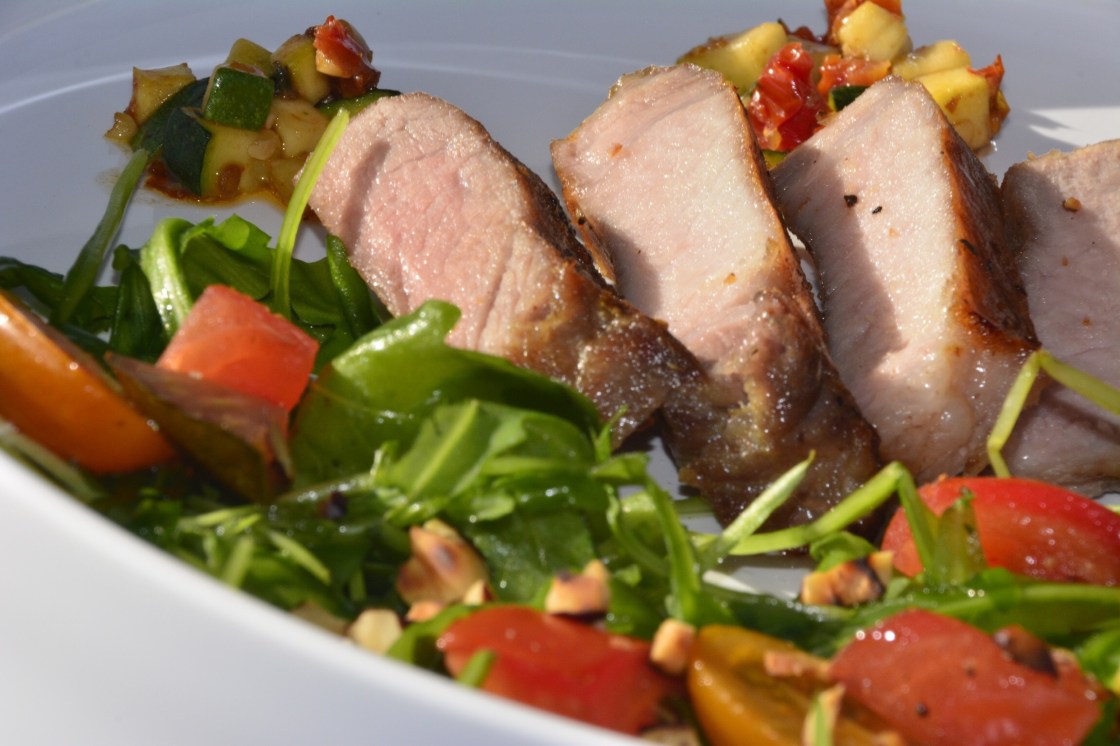 Den Rucolasalat habe ich mit gutem Arganöl angemacht, darüber ein paar kleine, sehr saftige Kirschtomaten und zerkleinerte, geröstete und gesalzene Haselnüsse gestreut.