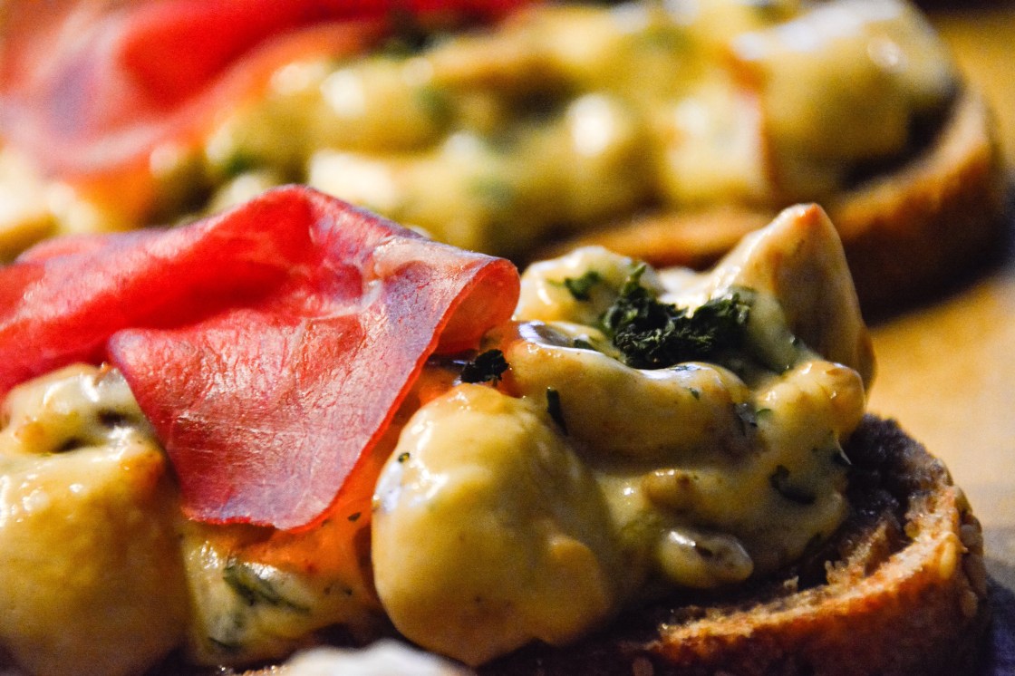In der Zwischenzeit das gebutterte Brot für 2 Minuten unter den heissen Grill stellen, damit es etwas knusprig wird.Den Käse zu der Pilz-Sahnemischung geben und schmelzen lassen. Mit Salz und Pfeffer und einem Spritzer Zitrone abrunden. Mit frisch gehackter Petersilie bestreuen. Das Brot aus dem Ofen nehmen, die Pilzmischung drauf verteilen, auf jede Scheibe Brot ein Stück Bündnerfleisch setzen und noch einmal kurz in den Ofen schieben zum anrösten.
