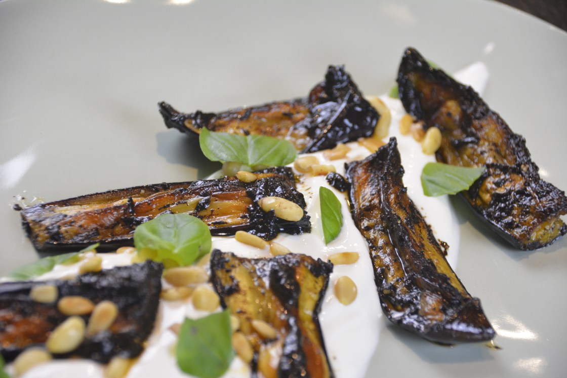 Den Yoghurt durchrühren, auf einer Platte verstreichen. Die Auberginen darauf anrichten. Mit den frischen Basilikumblätter-grössere Blätter zerzupfen- und den gerösteten Pinienkernen bestreuen. Mit einem Spritzer guten Olivenöl abrunden und servieren.