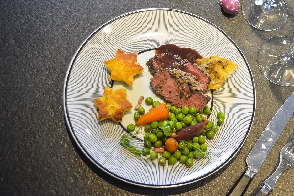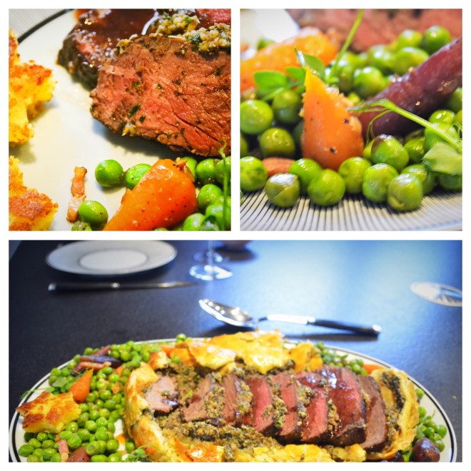 Als Gemüse gab es grüne Erbsen und kleine Möhrchen. Kartoffeln finde ich muss man nicht unbedingt dazu haben, da der Blätterteig mit der Farce sehr lecker schmeckt und doch auch gehaltvoll ist.