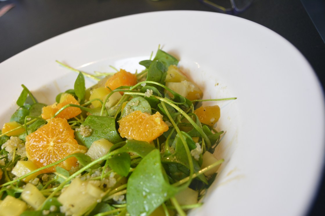 Nun die Vinaigrette anrühren, die Bete in die Vinaigrette geben, den Portulak dazu. Alles gut vermischen. Den abgekühlten Quinoa dazu geben, noch einmal mischen, damit die Vinaigrette überall verteilt ist. Zuletzt die Manadarinenscheiben drauf legen.