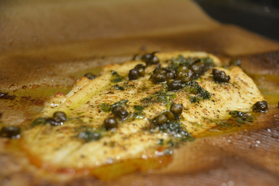 Mir hat die Art und Weise den Fisch im Backofen unter dem Grill zu machen sehr gut gefallen. Es war unkompliziert, schnell, und fast geruchlos. Der Fisch war auf der oberen Seite leicht gebräunt und hatte auf der unteren Seite zartgegartes weisses Fleisch. Und die Kapern waren für mich der Knaller. Werde ich nächstes Mal als amuse bouche beim Apéritif servieren. Leicht gesalzen und knusprig, für mich tolles Knabberzeug.