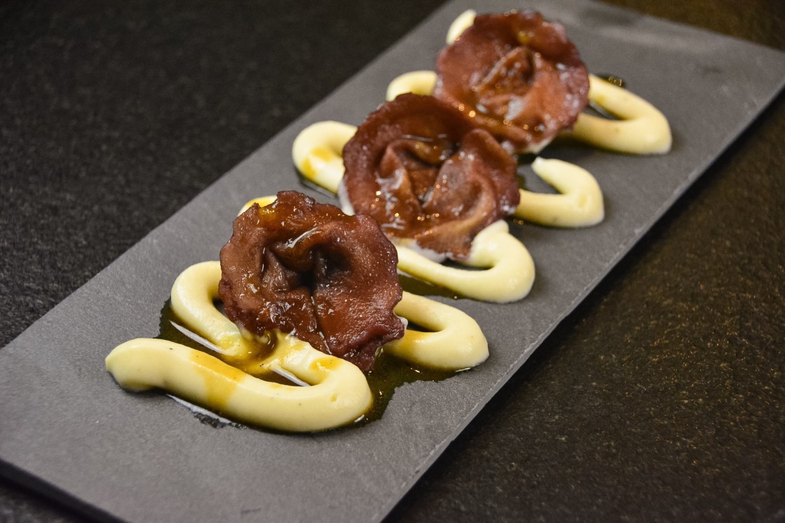 Für die Füllung, den Ochsenschwanz in 5-6 Stücke teilen lassen. Das Fleisch ohne Oel in einen Bräter geben. 2 Zwiebeln, die einfach in der Mitte durchgeschnitten werden und mit der Schnittfläche nach unten ebenfalls in den Bräter zum Fleisch setzen. Den Bräter, ohne Öl, für eine Stunde in den Ofen bei 200 Grad (Umluft) setzen. In der Zwischenzeit das Wurzelgemüse waschen und grob zerkleinern. Olivenöl in einen Topf geben, das Wurzelgemüse anbraten, das Tomatenmark unter rühren, etwas gehen lassen, dann mit etwas Rotwein ablöschen und diesen einkochen lassen. Mit dem restlichen Wein und dem Geflügelfond nach und nach aufgiessen. Die Gewürze und Kräuter dazugeben, Deckel drauf, und den Ochsenschwanz für 3 Stunden langsam schmoren lassen.Danach das Fleisch sauber von den Knochen trennen . Durch die feine Scheibe des Fleischwolfs drehen. Das Fleisch mit etwas Sauce vermengen, kräftig mit Salz und Pfeffer abschmecken.