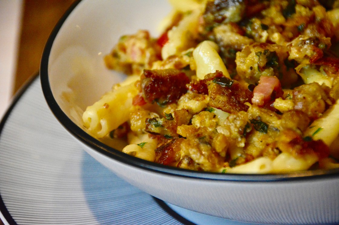 Olivenöl in der Pfanne erhitzen. Die Brotmasse in die heisse Pfanne geben und knusprig anbraten. Immer wieder mit dem Kochlöffel durch die Pfanne rühren, damit schöne kleine knusprige Krümelchen entstehen , der Käse schmilzt langsam, der Speck wird knusprig. Ein drittel dieser knusprigen Masse habe ich aus der Pfanne genommen und zur Seite gestellt.Nun noch schnell die Tomaten mit in die Pfanne geben, die Sahne und die crème fraîche dazu geben, so wie die gekochten Nudeln. Alles gut durchmischen und auf  vorgewärmten Teller servieren. Als Topping obendrauf die knusprigen Krümelchen streuen,