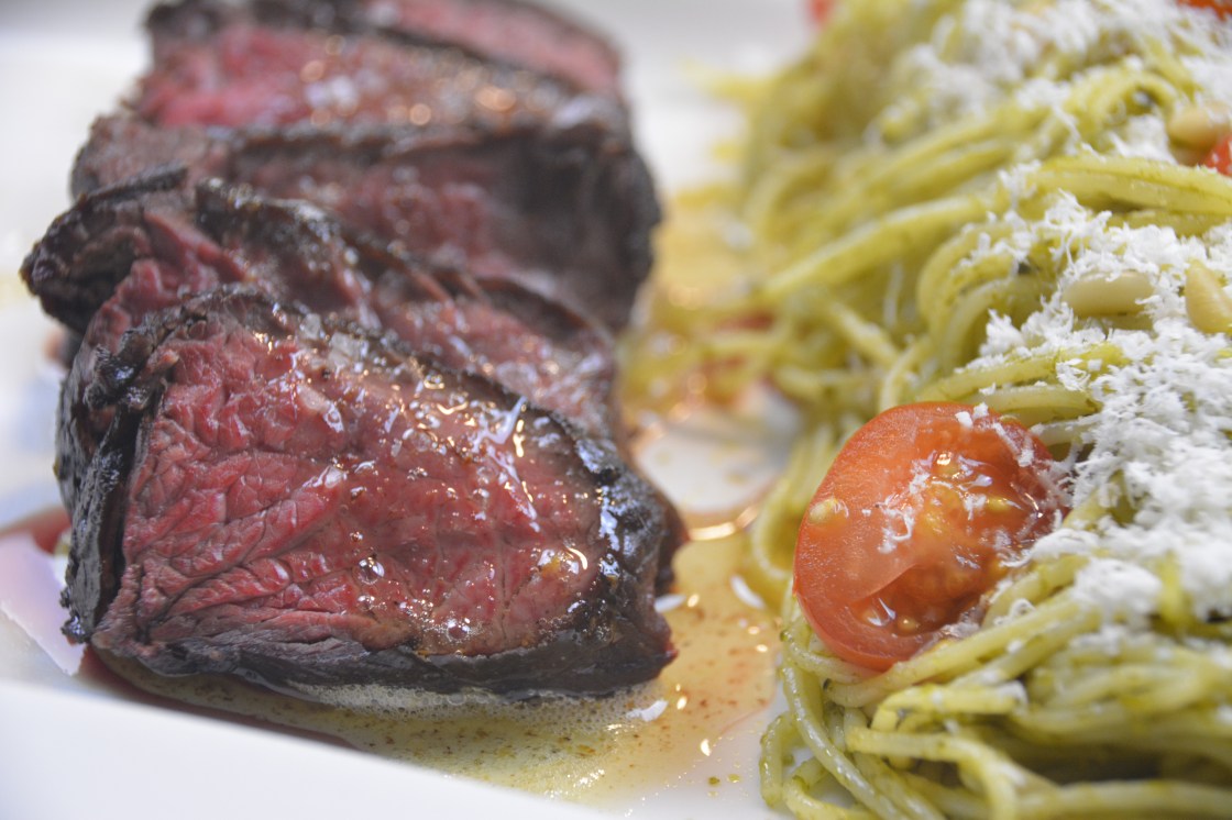 Das Fleisch nach der Ruhephase in schöne dicke Tranchen schneiden . Die Capellini mit dem Pesto auf den Teller legen und das Fleisch darauf präsentieren.