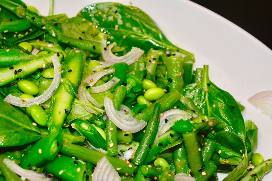 Einen grossen Topf mit Wasser und einer Prise Salz zum kochen bringen. Den Spargel hineingeben und für 3 Minuten blanchieren. Mit einem Schaumlöffel herausheben und im Eiswasser abkühlen.Die grünen Bohnen in dem selben Wasser aldente kochen. Herausnehmen und auch im Eiswasser abschrecken.Die Edamame im kochenden Salzwasser für 5 Minuten blanchieren.Wenn ihr die aufgetauten dicken Bohnen verwendet, dann für 2 Minuten blanchieren, und aus ihrer hässlichen Haut drücken.Nun das ganze Gemüse abtropfen lassen .