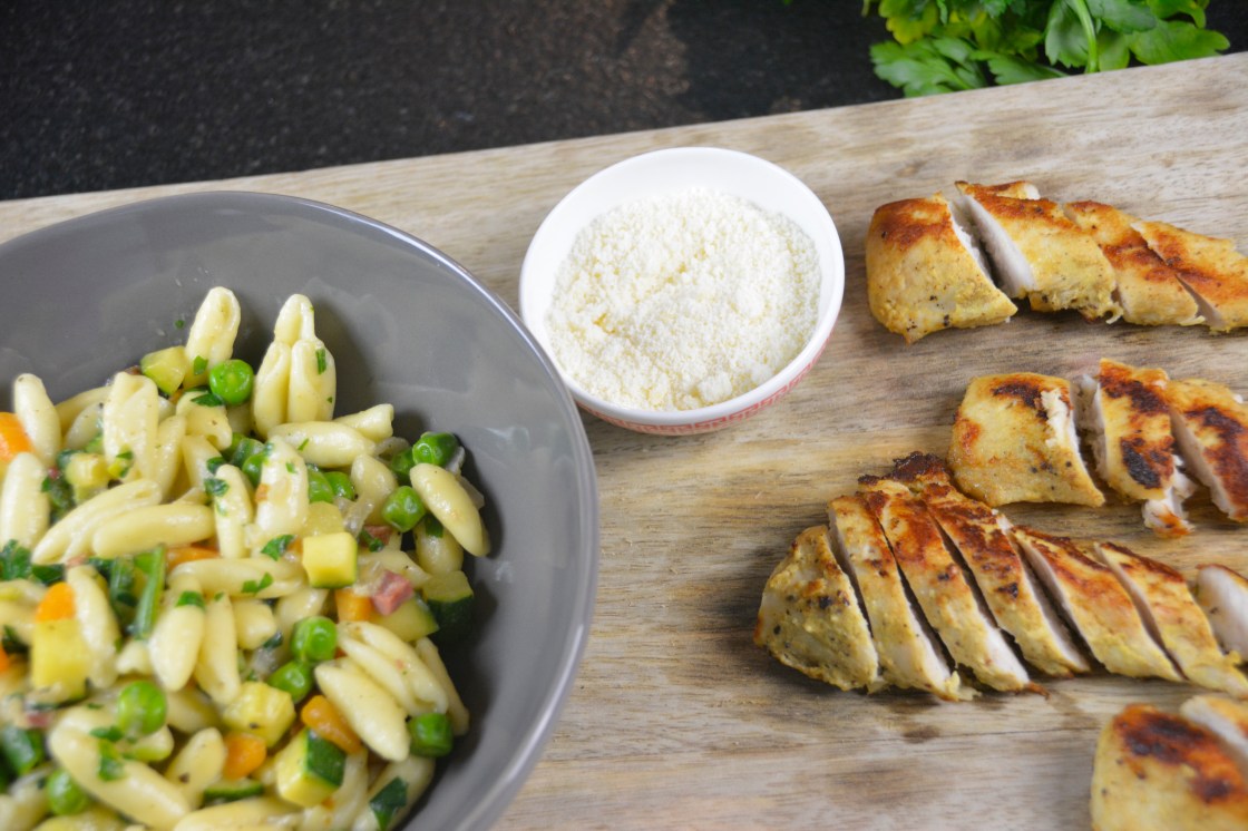 Die Nudeln abschütten, etwas von dem stärkehaltigen Nudelwasser zurückbehalten, und mit dem Frischkäse verrühren und in den Wok geben, so bekommt ihr eine schöne sämige Sauce. Die Cavatelli mit in den Wok geben. Das Fleisch anschneiden. Die Nudel-Gemüsemischung auf den Tellern anrichten, Parmesan drüberstreuen. Das Fleisch drauf legen und geniessen.