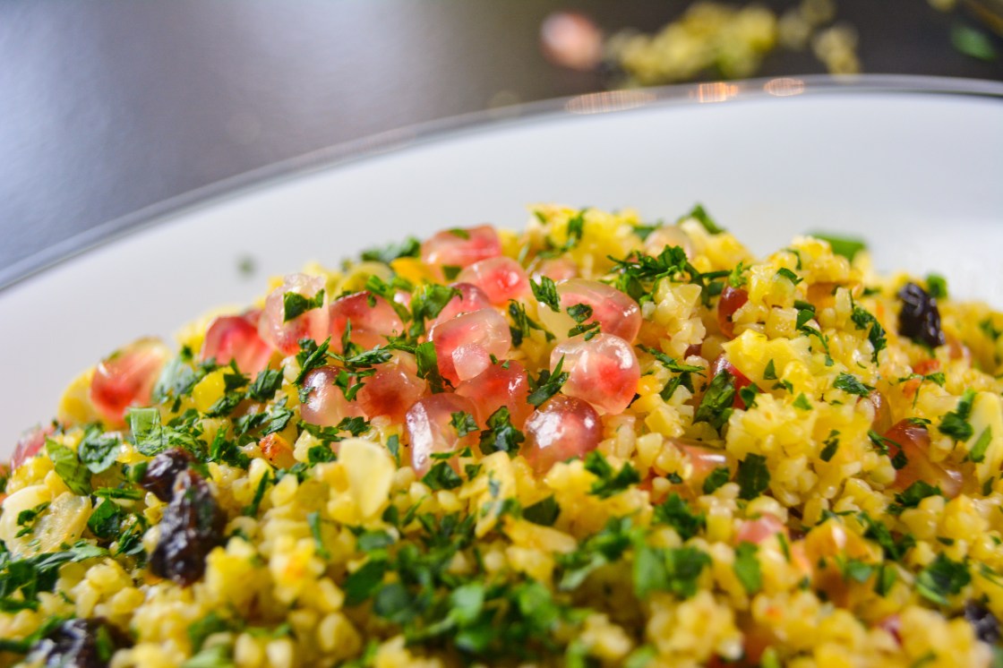 Die Kräuter kleinhacken. Die Mandelblättchen in einem Spritzer Olivenöl rösten, aber stetig aufpassen dass sie nicht verbrennen. Die Kerne des Granatapfels befreien und in einer kleinen Schüssel beiseite stellen. Den Saft des Granatapfels über den Bulgur geben. Die getrockneten Kirschen halbieren.