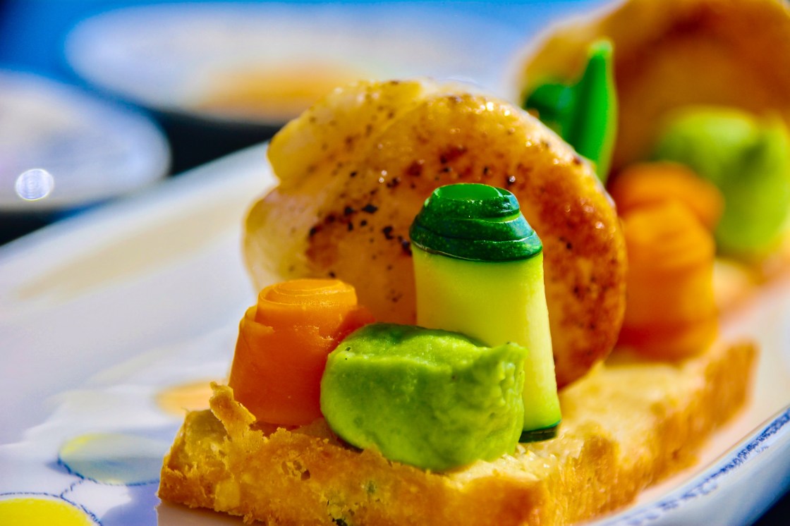 Die Jakobsmuschel hochkant mittig auf die Parmesanhippe setzen, die Karotten und Zucchinirollen an den Enden der Hippe platzieren, dazwischen das Erbsenpüree spritzen. Das Ganze mit fleur de sel bestreuen über die Jakobsmuschel etwas getrocknete Orangenschale geben und sofort servieren.