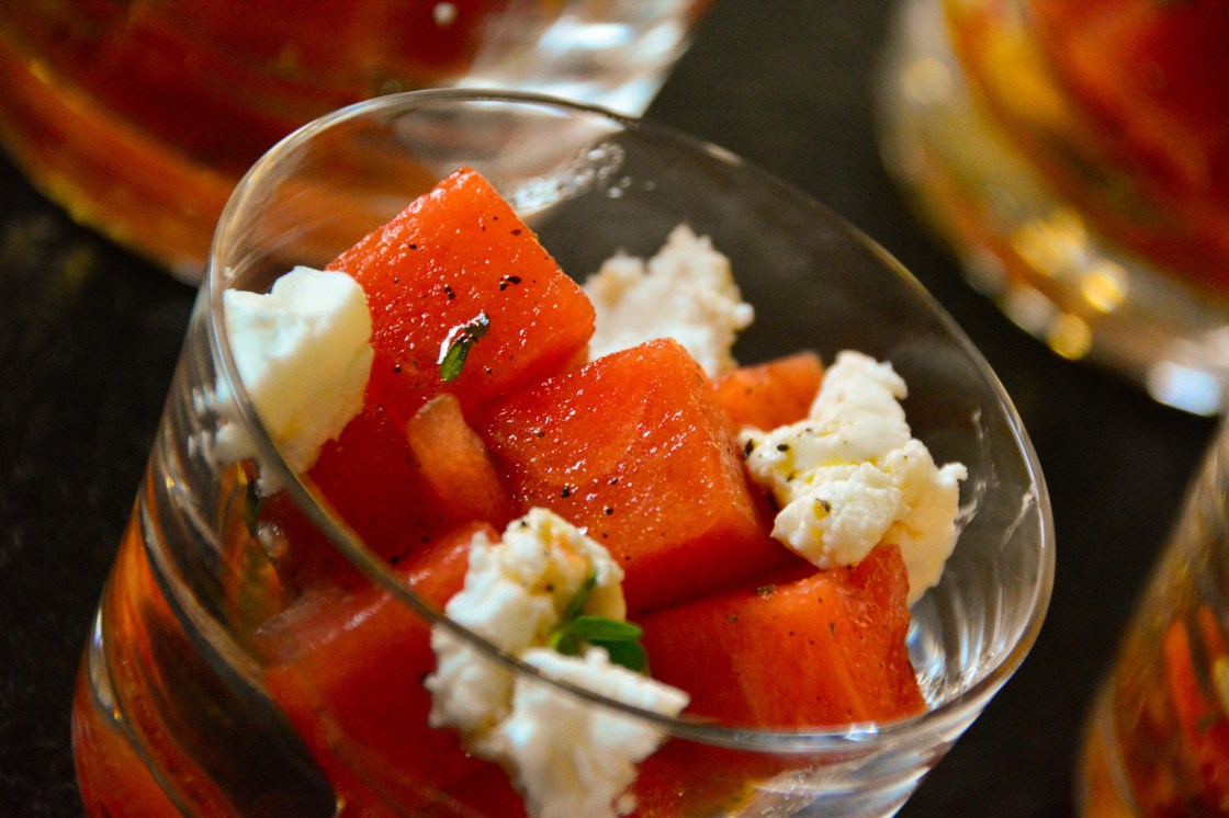 Dieser Salat begleitet mich schon einige Jahre durch den Sommer. An sehr heissen Tagen ist er super erfrischend, benötigt keine langen Vorbereitungen, ist farblich ein eye catcher, und schmeckt wunderbar erfrischend. In kleine Gläser abgefüllt, passt er auch sehr schön als amuse bouche. Für „Feinde“ der Ziege kann man ihn als Alternative auch mit Büffelmozzarella oder Feta servieren.