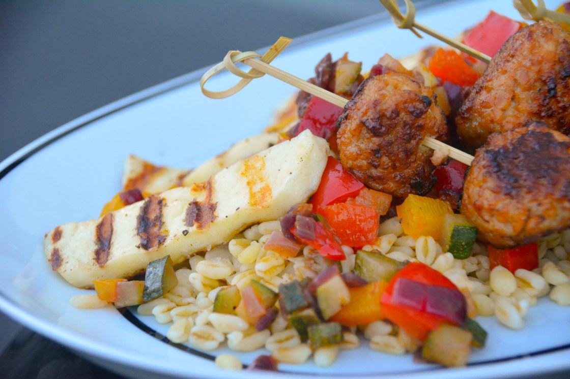 Nun gehts ans Anrichten. Ich habe alles auf einer grossen Platte angerichtet. Zuerst die leckeren Weizenkörner auf der Platte verteilen, dann das geschmorte Gemüse dazu geben. Den gegrillten Haloumi drüber legen. Das Fleisch habe ich auf kleine Holzspiesse aufgespiesst, und dazu gelegt. Man könnte auch alles zusammen vermischen und anrichten…….Jeder so wie er mag und jetzt: Lasst es euch schmecken!!
