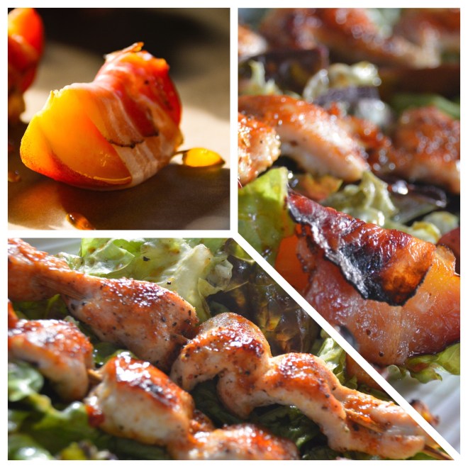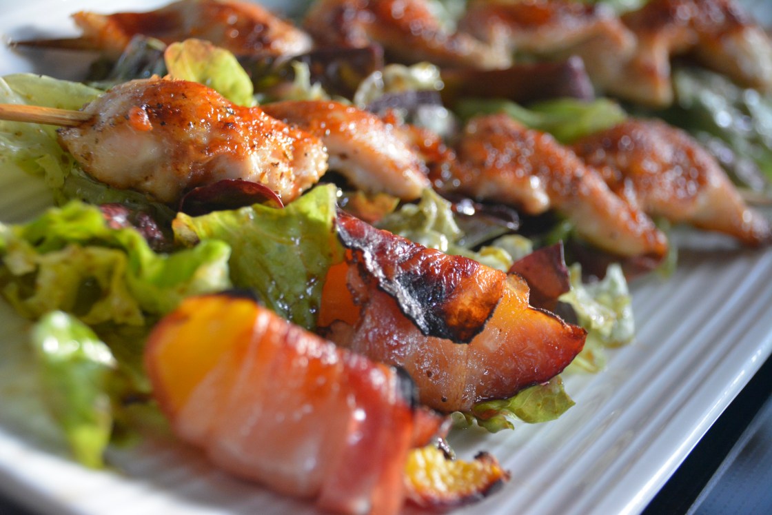 Salat-Hähnchenspiess-Nektarine im Speckmantel