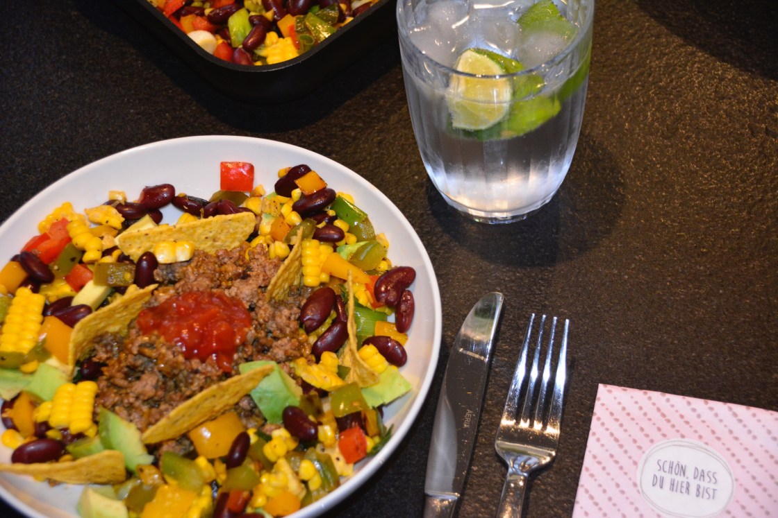Die lecker süssen und knackigen Maiskörner haben wieder Saison. Sie stehen in keinem Vergleich zu den Maiskörnern aus der Dose. Die haben absolut keinen Geschmack, sind sehr süss und glitschig….NO Go. In diesem Gericht gibt es knackige Maiskörner, süssliche Paprikas, knusprige Krümmelchen aus Rinderfilet, frische Zwiebeln, rote Chilibohnen, leicht gesalzene Nachos und eine leckere Tomatensalsa…..