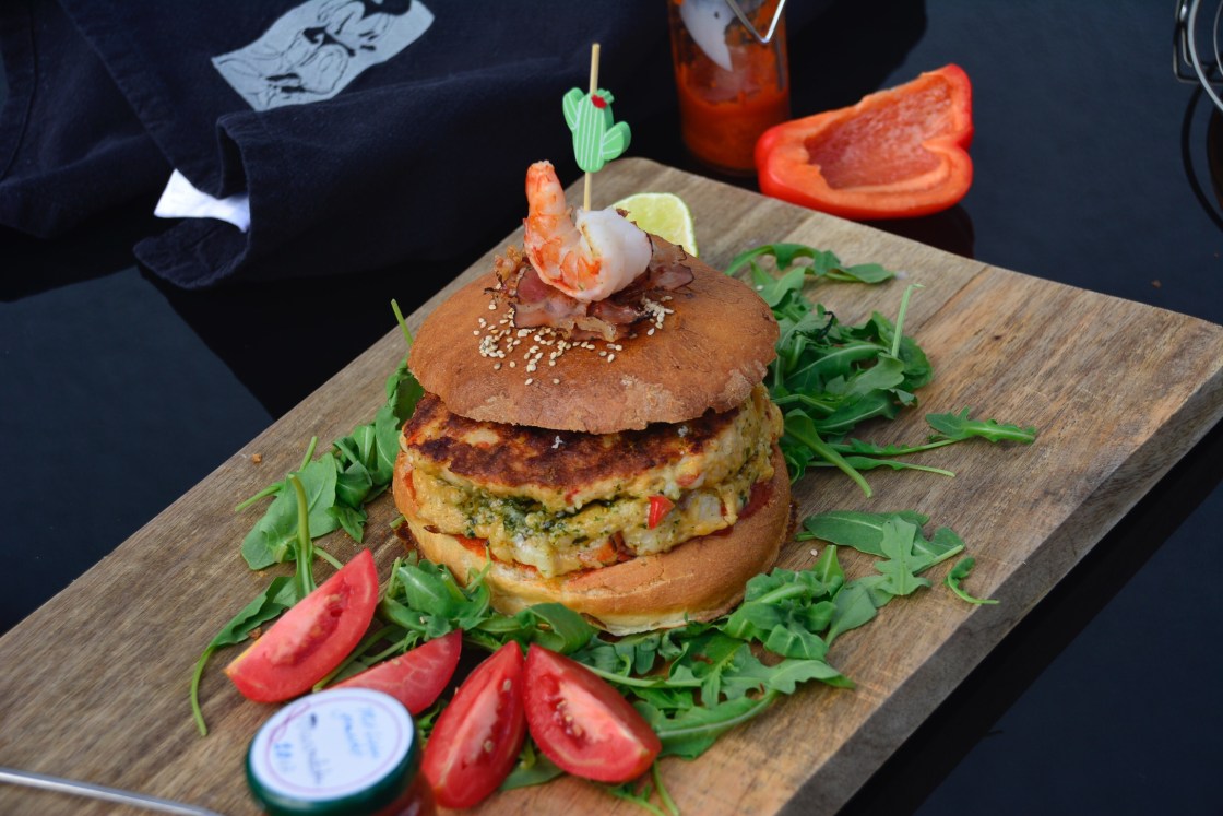Burger muss ja nicht nur aus Fleisch bestehen, oder? Ich habe es gewagt und Hähnchenfleisch mit Scampis gemischt…..ein Genuss. Diesen Burger habe ich mit selbstgemachten Zutaten veredelt. Unter anderem mit Basilikum Pesto home made, eine wohlschmeckende Paprika-Marmelade so wie selbst gebackenen Brioche-Burger-Buns. Eine etwas schnellere Variante funktionniert aber auch mit herkömmlichen fertig gekauften Brötchen und Pesto aus dem Glas, so wie Ketchup anstatt von Marmelata.