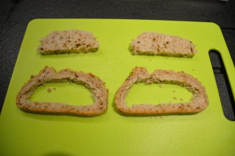 Ihr schneidet entlang der Kruste das Brotinnere aus der Scheibe Brot heraus.