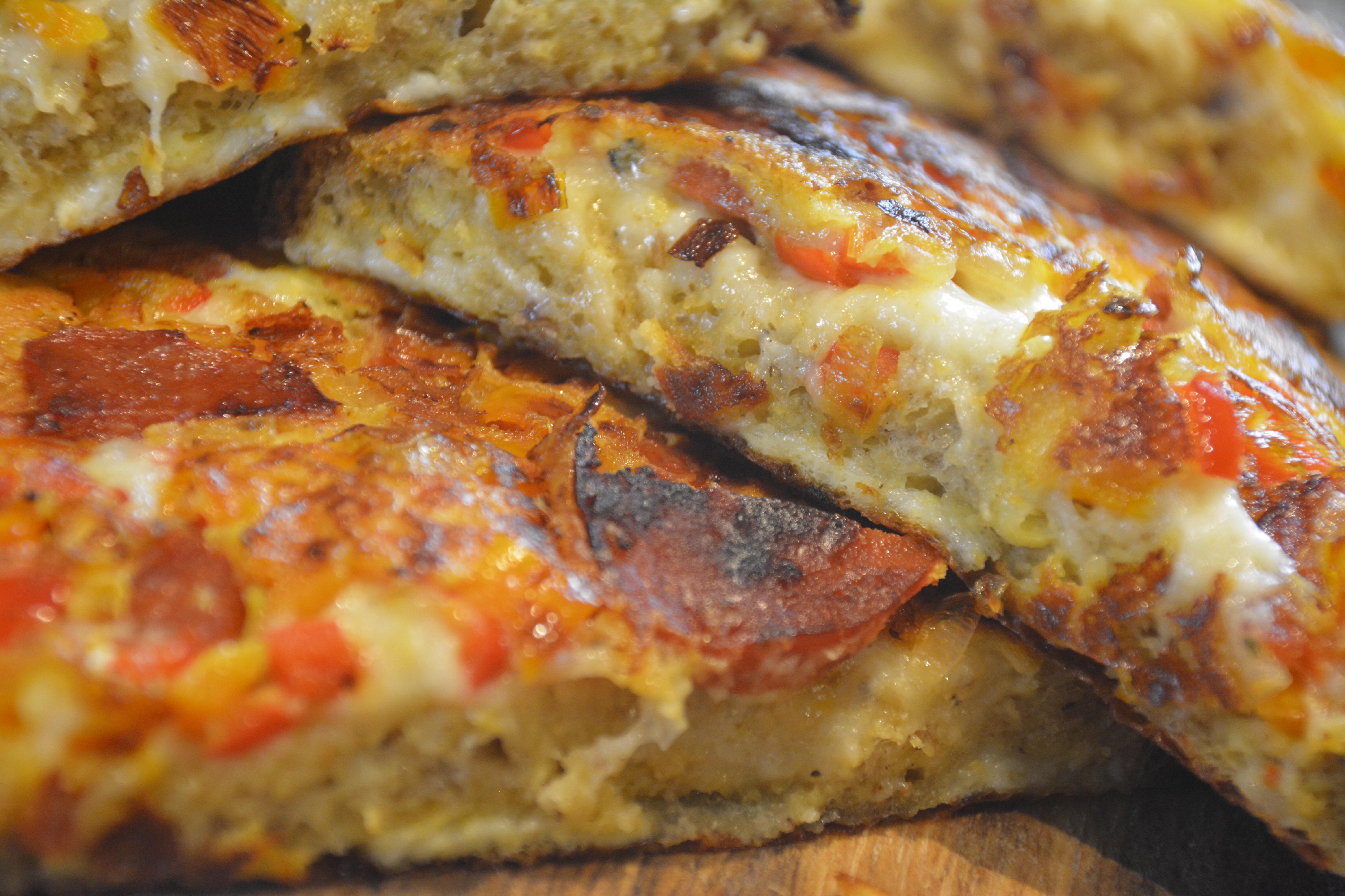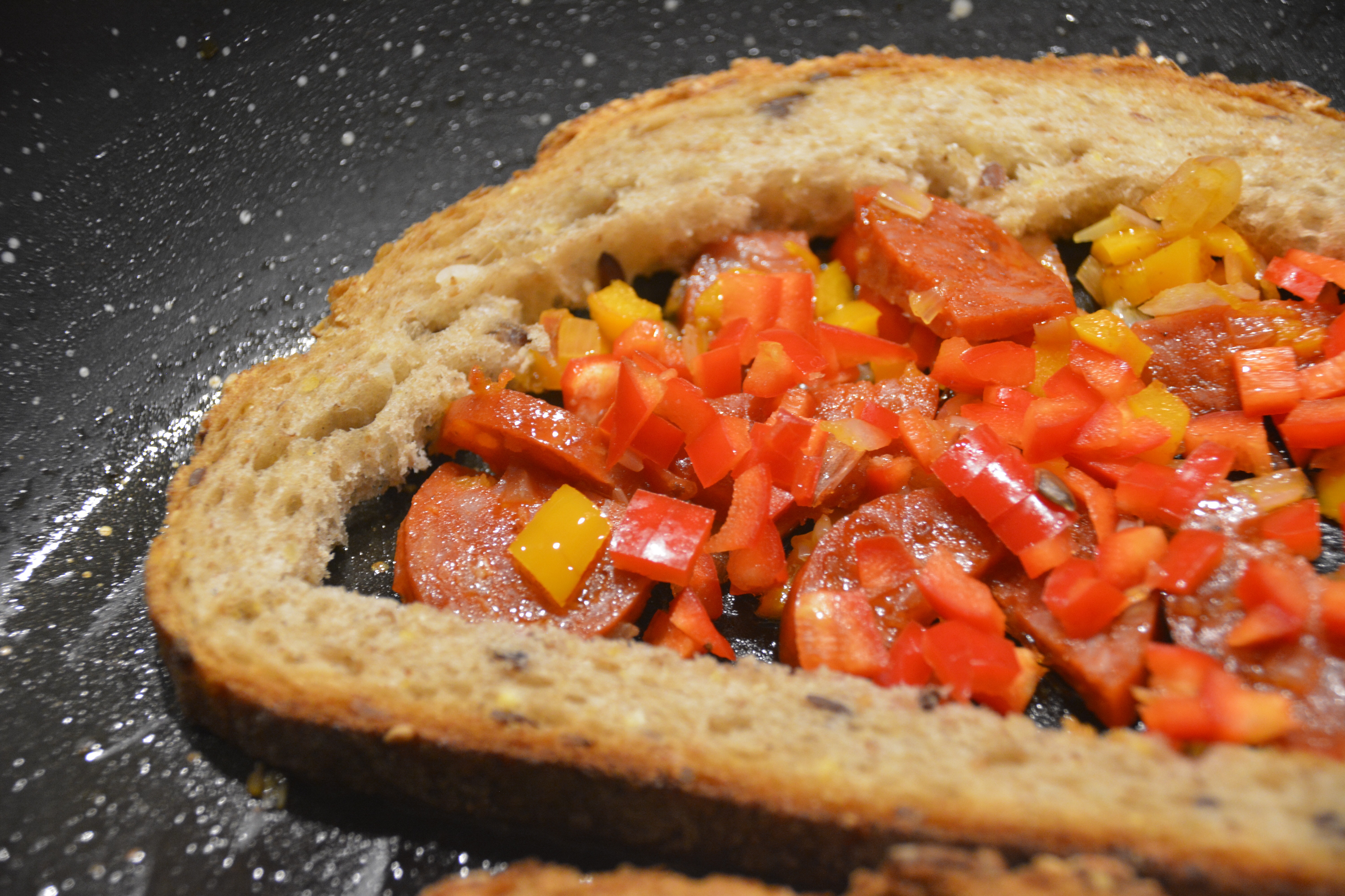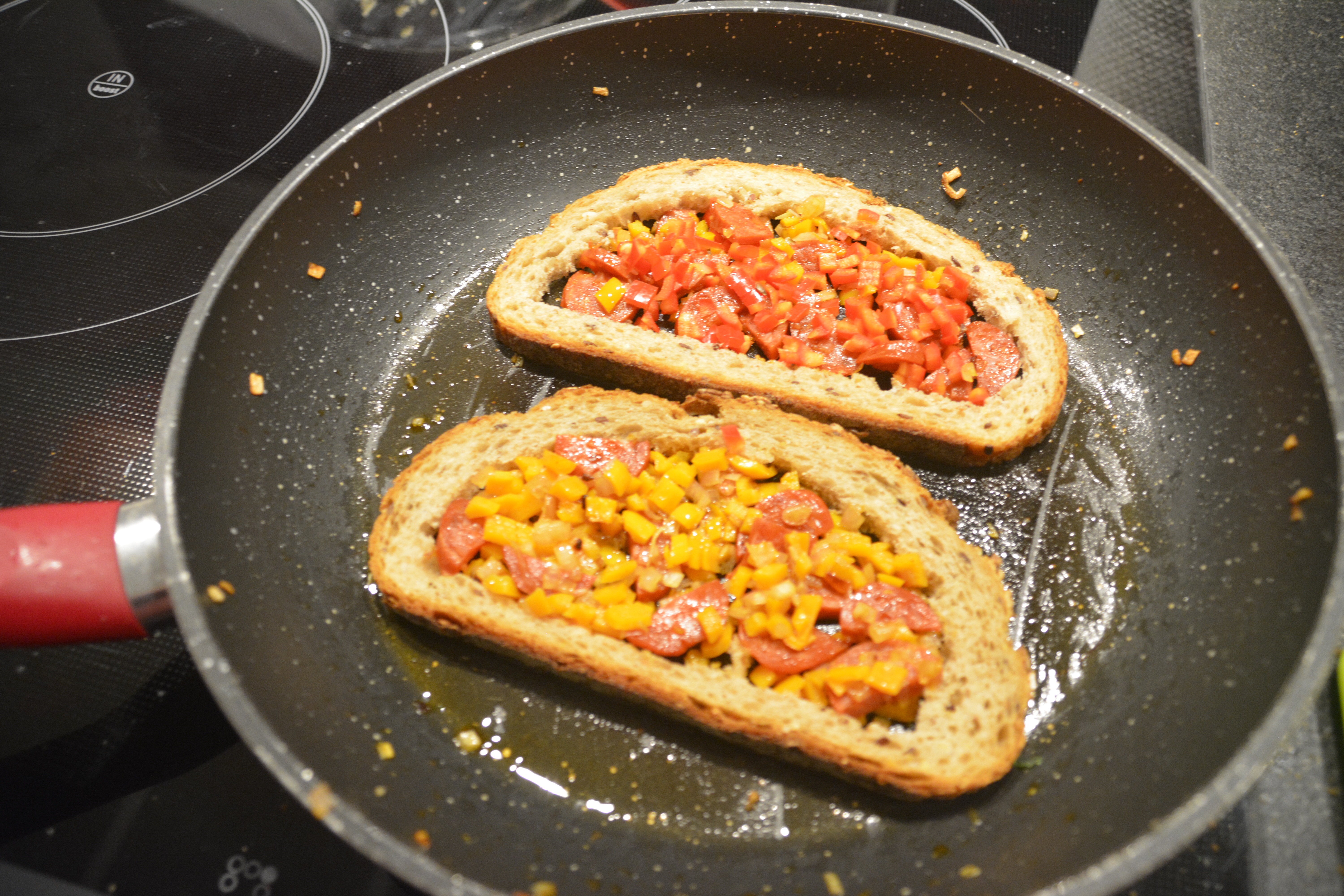 Die Rinde des Brotes in derselben Pfanne platzieren, die ausgeschnittenen Brotscheiben mit der Paprika-Wurst-Mischung auffüllen. Die Ei-Käsemischung langsam über die Paprika giessen bis jeder Freiraum aufgefüllt ist. Nun das ausgeschnittene Brotinnere wieder auflegen und langsam andrücken, so dass das Brot sich mit der Ei-Käse Mischung vollsaugt, und das Brotinnere wieder in die Brotkruste passt. Ungefähr 3-4 Minuten langsam knusprig werden lassen. Die zweite Brotseite ebenfalls mit der restlichen Ei-Käsemischung bestreichen und vorsichtig mit einem Pfannenwender umdrehen. Auf der Seite auch noch einmal schön kross und knusprig anbraten.