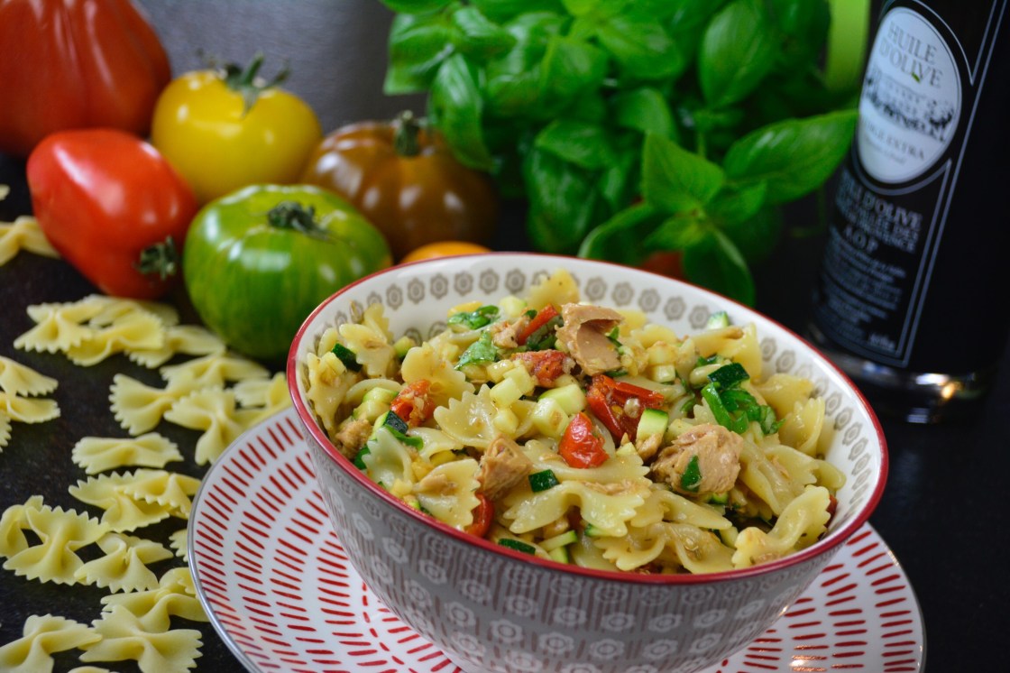Eine von vielen Variationen von einem sehr einfachen, aber schmackhaftem Nudelsalat ohne schwere Mayonnaise, sondern mit einer leichten Vinaigrette aus hochwertigen französichem Olivenöl und Balsamico Essig. Dazu Zucchini, halb getrocknete Tomaten, Thunfisch , gerösteten Pinienkernen und frisches Basilikum….Und wenn man den Salat dann auch noch draussen in der Sonne geniessen kann, dann ist für mich zumindest , die Mittagspause perfekt.