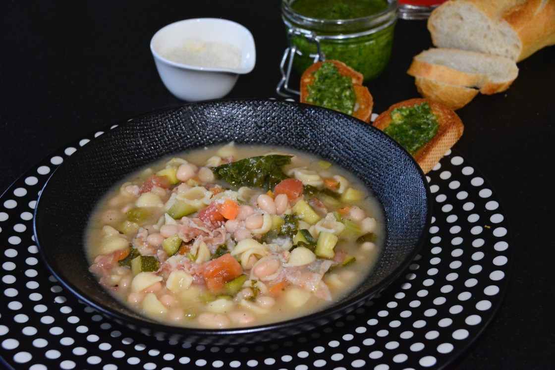 Jetzt wo das Gemüse aus dem Garten so intensiv schmeckt, ist der richtige Moment einen grossen Topf Gemüsesuppe für die kühleren Tage, die ja unausweichlich kommen , zu kochen. Ich habe mich an eine Suppe erinnert die ich vor Jahren mal in Italien gegessen habe, mit diesen kleinen weissen Bohnen, viel Gemüse etwas Pancetta…Die Suppe wird gebunden mit der Hälfte der weissen Bohnen, die einfach mit etwas Kochbrühe püriert werden. So erhält die Suppe eine etwas dickere Konsistenz und gewinnt dazu auch noch an Geschmack. Da ich sehr gerne ein Stück Brot zur Suppe esse, habe ich mir 2 Stück Baguette im Ofen gegrillt und darauf etwas von meinem frisch gemachten Pesto verteilt….. Mir hats hervorragend geschmeckt, und den Rest der Suppe kommt in den Tiefkühler für kältere Tage.