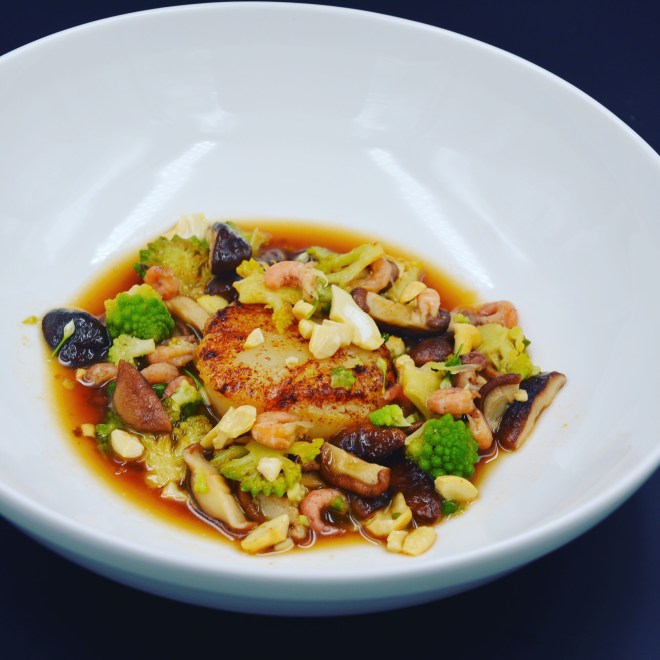 Nun kommen wir zum Hauptdarsteller dieses Gerichtes, der Jakobsmuschel. Ihr verzeiht mir, aber die Jakobsmuschel schmeckt mir einfach am besten wenn sie in etwas Nussbutter angebraten ist. Ich habe sie im Vorfeld mit etwas geschmolzener Butter eingepinselt und dann in der sehr heissen Nussbutter von beiden Seiten für eine Minute angebraten. Salz, etwas schwarzen Pfeffer und einen Spritzer Limonensaft dazu, fertig.