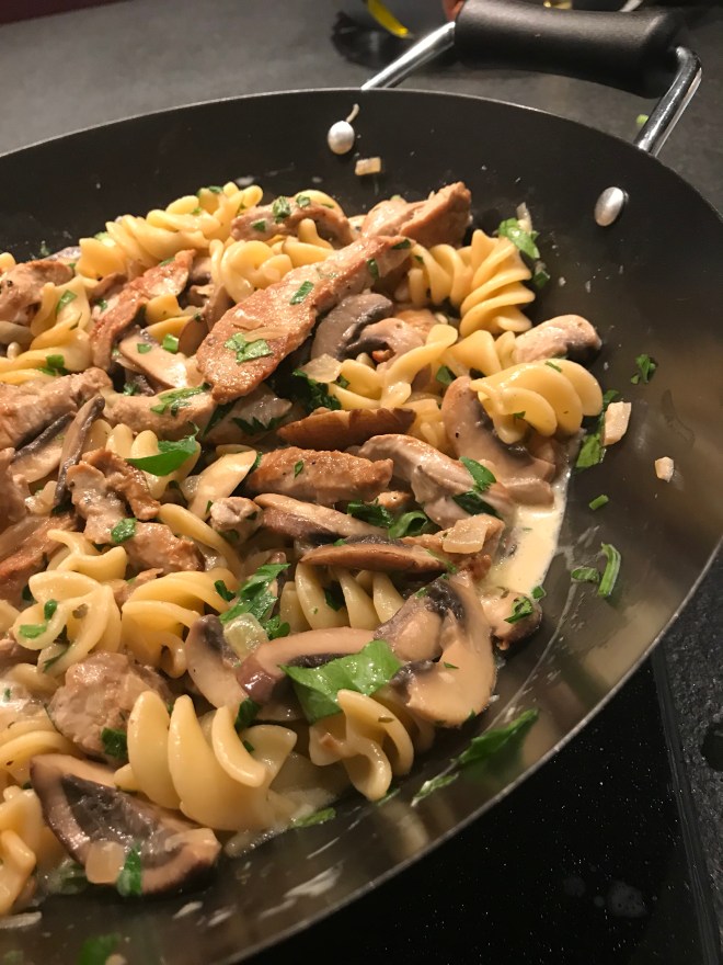 Kalbsgeschnetzeltes mit Pilzen und Nudeln. Ein ganz simples Gericht, was sehr alltagstauglich ist. Es ist innerhalb von 30 Minuten fertig. Benötigt keinen grossen Einkauf. Aber gute und frische Zutaten. Ich hatte dieses Gericht seit Ewigkeiten nicht mehr gekocht. Aber als ich abends nach getaner Arbeit in den Supermarkt ging und keine rechte Idee hatte was ich kochen sollte fiel mir dieses Kalbsgeschnetzelte ins Auge . Ich weiss ja nicht wie es euch geht, aber in solchen Momenten beginnt bei mir eine Art Kopfkino. In meinem Kopffilm kamen sofort schöne fleischige Champignons, frische Petersilie und Sauce drin vor…… als Beilage stand zur Auswahl, entweder ein frisches Stück Baguette zum „tunken“ der Sauce, oder doch lieber Nudeln? In meinem Film gab es dann schliesslich ein Happy End mit der Nudel. 🙂