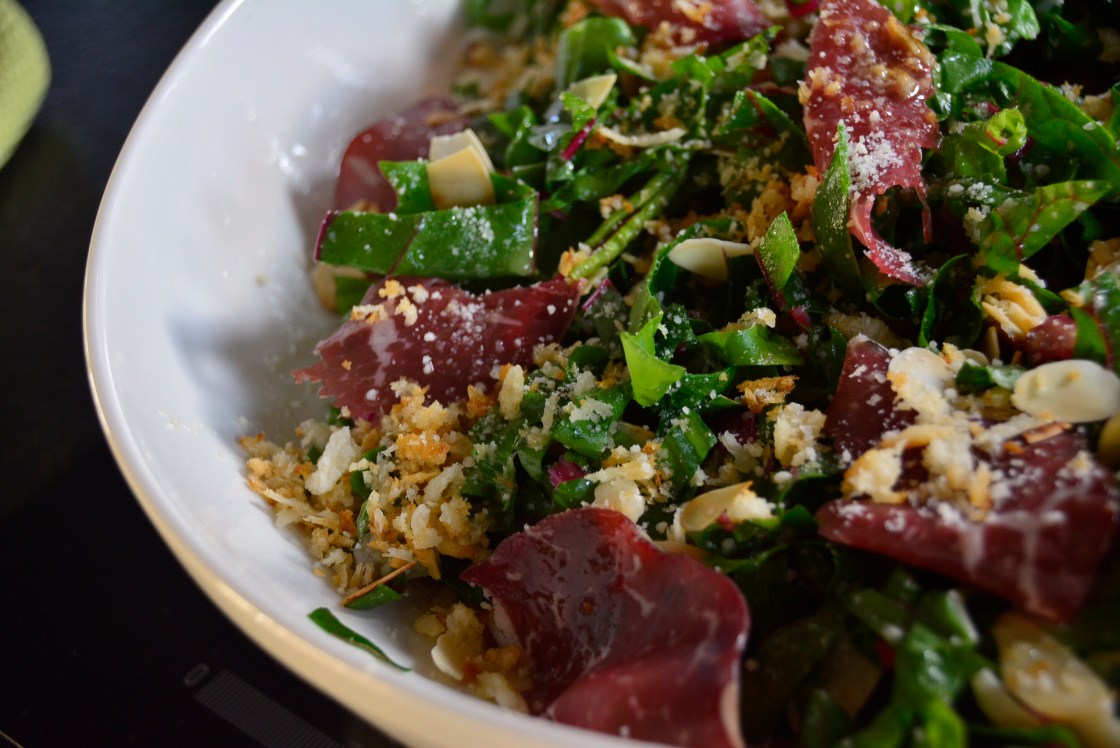 Die Mangoldblätter gründlich waschen, trocken tupfen, von den Stielen befreien. Die Stiele in sher kleine Stücke schneiden. Die Blätter aufeinander legen , und in längliche Streifen schneiden. Die Mangoldblätter in einer grossen Schüssel zusammen mit den Stielen, dem restlichen Parmesan und der Hälfte der Vinaigrette mischen. Bresaola dazu geben, so wie die gerösteten Mandelblättchen . Zuletzt werden die leckeren Parmesanbrösel, so wie der restliche Parmesan grosszügig drübergestreut, mit der restlichen Vinaigrette beträufeln, wenn nötig, einmal durchmischen und sofort servieren.