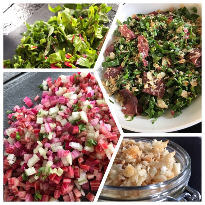 Ich kannte Mangold bis jetzt nur gedämpft, und wäre wahrscheinlich nie auf die Idee gekommen ihn roh zu verkosten. Aber ich kann euch sagen, probiert es aus. Der Mangold schmeckt roh etwas säuerlich, vom Geschmack her zwischen jungem Spinat und Sauerampfer. Die tollen farbigen Stiele werden minitös kleingeschnitten und sind herrlich knusprig. Die Zitronenvinaigrette wunderbar erfrischend und überhaupt nicht zu sauer. Die Panko Parmesanbrösel …da werde ich ganz sicher zum Wiederholungstäter 😉 Es ist ein gesunder Salat mit viel frischen Vitaminen und wenigen Kalorien.