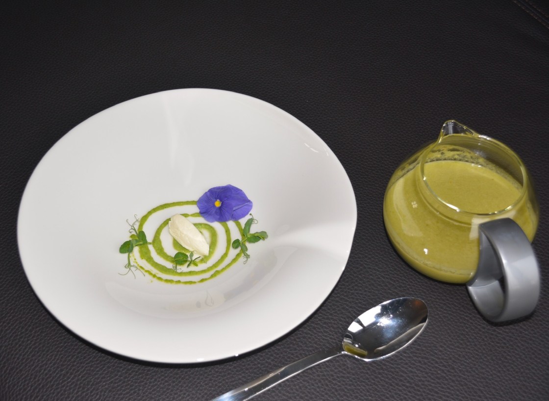 Nun zum anrichten des Püree’s, wie schon erwähnt mit der Squeezerflasche oder dem Spritzbeutel eine schöne Spirale in den Teller malen. In die Mitte die Mascarpone Nocke oder Kugel setzen, mit den jungen Erbsensprossen garnieren. So können sie ihren Gästen die Teller servieren und jedem am Tisch die Suppe eingiessen. Das ist ein kleines Highlight, erhebt die Spannung und kommt immer gut bei den Gästen an.