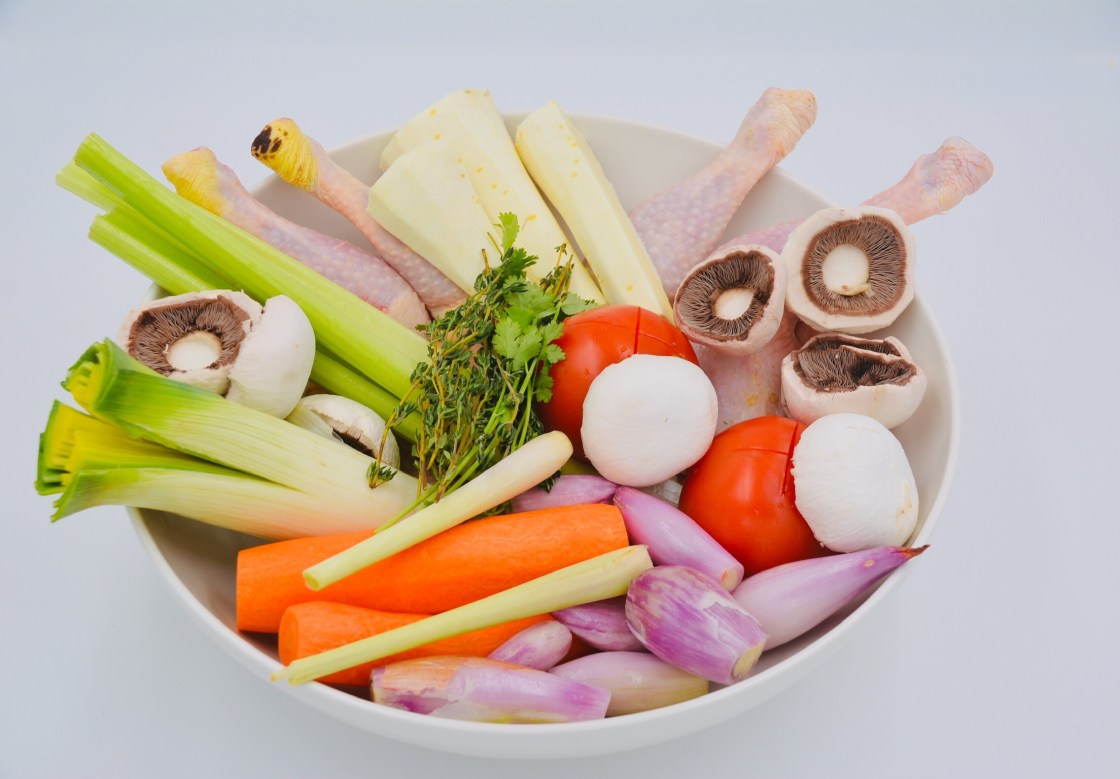 Was nicht fehlen sollte in einem Fond sind Karotte, Sellerie, Champignons, Zwiebel oder Schalotte, Tomate und frische Kräuter. Das sind die Hauptzutaten die sehr viel Geschmack abgeben, alles Andere was ihr dazu gebt ist euere Entscheidung. Ich liebe zum Beispiel Liebstöckel im Fond und Petersilenwurzel. Wenn man der Suppe einen asiatischen Touch geben möchte, kann man Zitronengras, Kafirlimettenblätter und Galgantwurzel dazu geben. Wie gesagt da sind eurer Fantasie keine Grenzen gesetzt. Zudem finde ich es sehr interessant in der Küche rumzuexperimentieren.