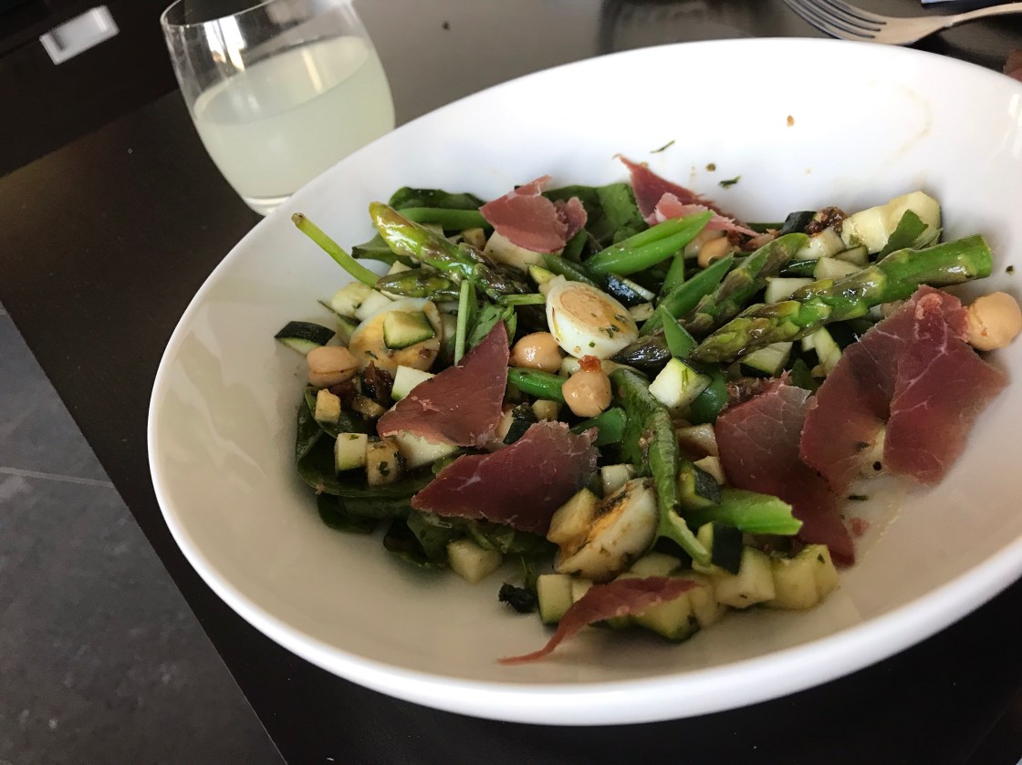 Alle Zutaten in die Vinaigrette geben und gut vermischen. Zuletzt habe ich dann noch mein gutes luftgetrocknetes Rinderfilet auf dem Salat verteilt.