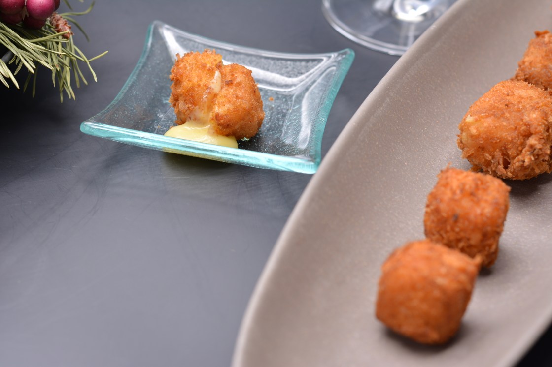 Als amuse bouche gibt es dieses Jahr bei mir einen Käsewürfel, mit Speck umwickelt, im Panko und Paniermehl gebraten. Einfacher Auftakt, aber schmeckt lecker. Dieser Würfel kann sehr gut am Vortag vorbereitet werden, und dann im Backofen erhitzt werden.