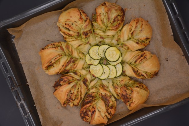 Die Blume in den vorgeheizten Backofen bei 200 Grad, mit Heißluft in 30 Minuten schön knusprig backen.