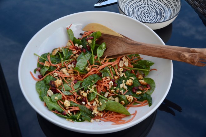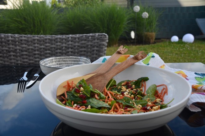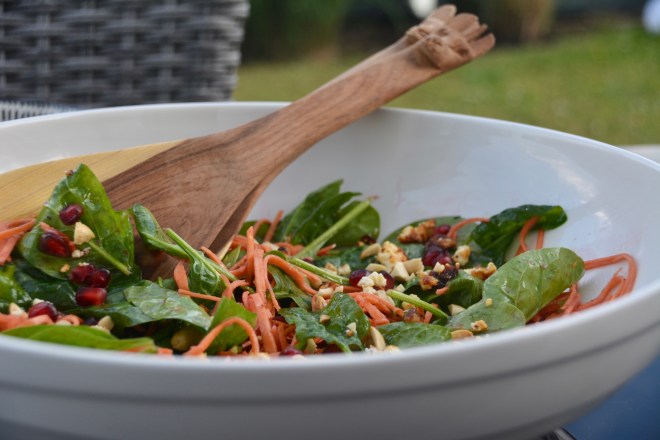 Hier ist ein schnelles, aber auch gesundes Rezept für einen leckeren Salat. Die Süsskartoffel schmeckt auch roh sehr gut, das habe ich eigentlich nicht gewusst, bis ich in einem Live Video von Herrn Trettl, das er zusammen mit seiner Frau während der Corona Krise täglich für uns gemacht hat, auch selbst ausprobiert hat. Die Süsskartoffel ist schön knackig, ähnelt roh eher einer Karotte und in Kombination mit dem Spinat und den Granatapfel Kernen ein stimmiges Gericht. .