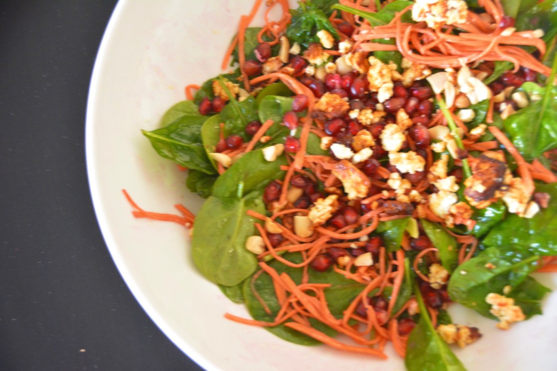 Den Spinat zu der Süsskartoffel in die Schüssel geben. Die Granatapfelkerne, so wie die gehackten Erdnüsse ebenfalls in die Schüssel geben. Alles gut vermengen. Zum Schluss den leckeren Fetakäse, der im Ofen goldbraun und knusprig geworden ist drüber streuen.