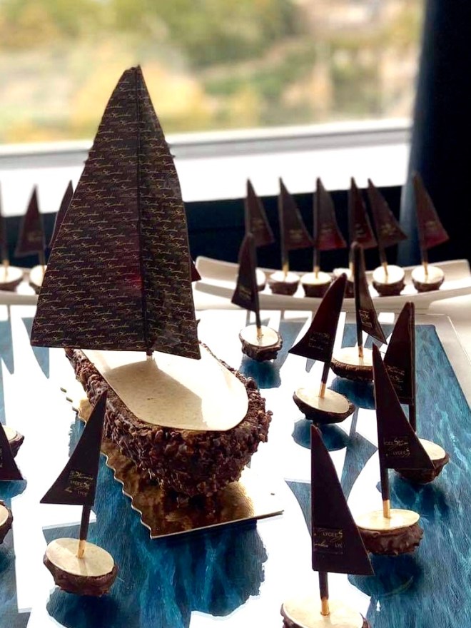 Emmanuel Hublot, liebenswerter Professeur de pâtisserie im Lycée Stanislas in Nancy, dem ich während einer Veranstaltung assistieren durfte als er seinen berühmten Baba Stanislas Mirabelle kredenzte. Dieses Mal verwöhnte er uns mit diesen wunderbaren Segelschiffen von der „Route du Rhum“. Außer Rhum bestechen diese hinreissenden Werke auch noch durch Erdnüsse, Vanille, Banane und wie kann es anders sein durch eine wunderbare Schokolade.