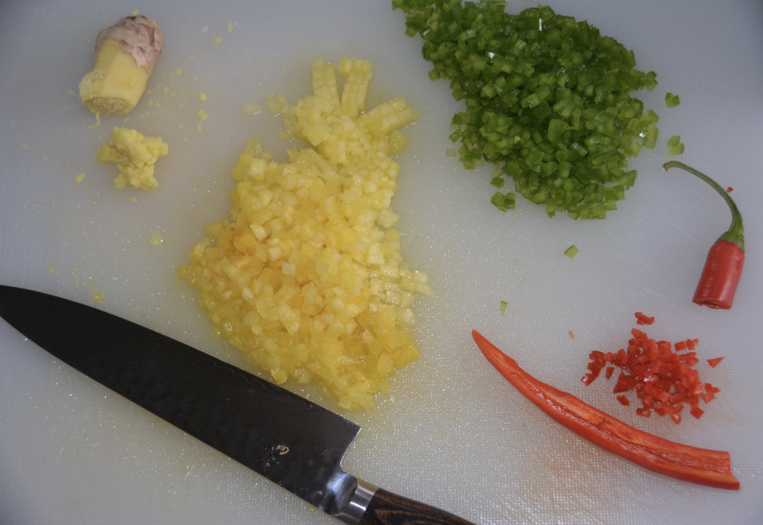 Ananas, Spitzpaprika so wie die Chilischote in sehr feine Würfelchen schneiden.