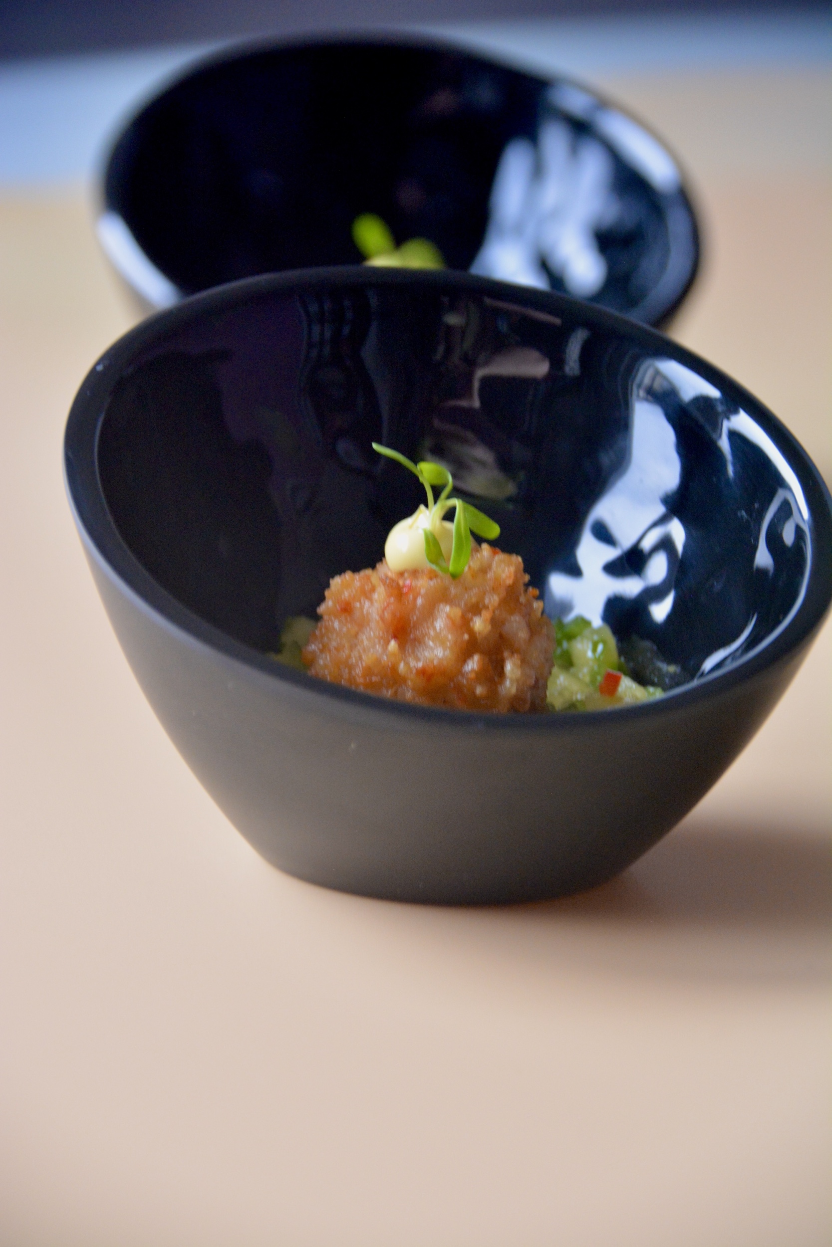 Die Scampis waschen, schälen und entdarmen . Mit Küchenpapier trocken tupfen. In einem Blender oder Mixer fein pürieren. Diese Aktion sollte so schnell als möglich geschehen, da das rohe Scampifleisch nicht durch die Mix Aktion erhitzt werden soll. Zudem kann es gerne etwas grob gemixt werden, gibt ein gutes Mundgefühl beim Essen. Den gehackten Scampis können nun die restlichen Gewürze untergemischt werden. Der fein geriebene Ingwer, die Sojasauce, Chilibrunoise, Salz und optional Scampigewürz von Schubeck. Alles gut vermengen und kalt stellen.
